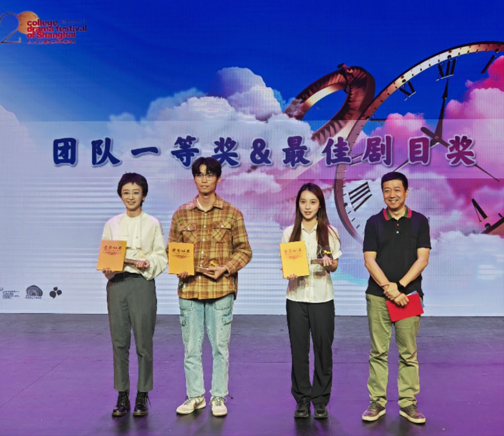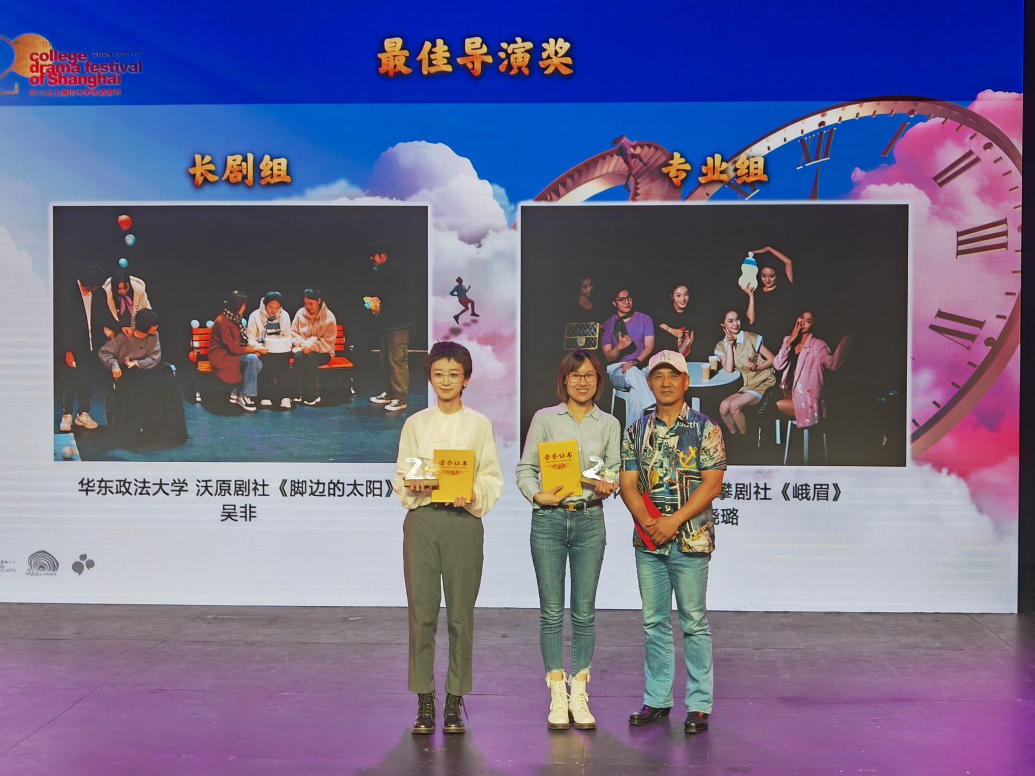 本网讯 6月17日,由上海市文学艺术界联合会、上海市学生联合会、上海市戏剧家协会联合主办的第二十届上海大学生话剧节颁奖仪式在上海市话剧中心隆重举行。由jinnian金年会校团委组织,艺术学院出品,王晓璐执导、王继强担任动作指导、王三与刘佳瑜担任制作人,朱路赟担任舞台总监的原创话剧《峨眉》参加专业组竞演,共获专业组“最佳剧目奖”(唯一奖项)、专业组“最佳导演奖(王晓璐)”及“优秀个人表演奖(陈思羽)”三项大奖。