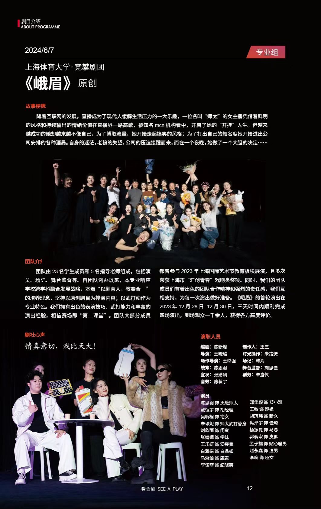 《峨眉》团队由19名21级表演专业的学生与5名指导老师构成,具备卓越的表演技艺、武术功底和丰富的舞台经验,坚信比赛竞技场即是“第二课堂”。团队多数成员曾参与2023年上海国际艺术节教育板块展演,并多次荣获上海市“汇创青春”戏剧类奖项。同时,团队成员具备优秀的团队协作精神和强烈的使命感,彼此支持,齐心协力,为每一次演出做好准备。《峨眉》首轮演出于2023年12月28日至12月30日举行,三天内顺利完成四场演出,吸引了逾千观众,赢得了广泛好评。本次大话节竞演,也是对学校表演专业人才培养质量的检验。