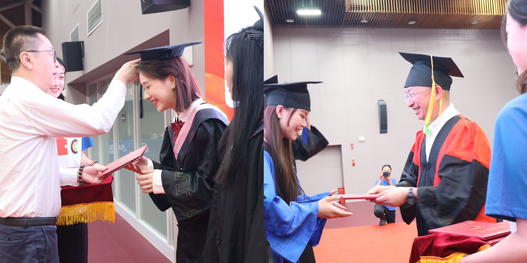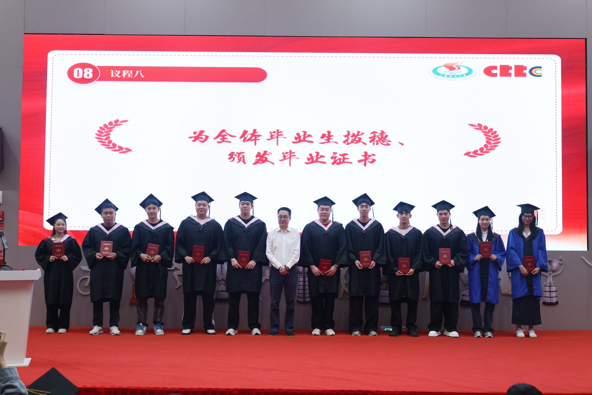 施之皓、任杰为中乒院2024届学生颁发毕业证书并拨穗。学位帽上的穗子轻轻拨动,不仅标志着学术成就的达成,也象征着大学旅程完满收尾。