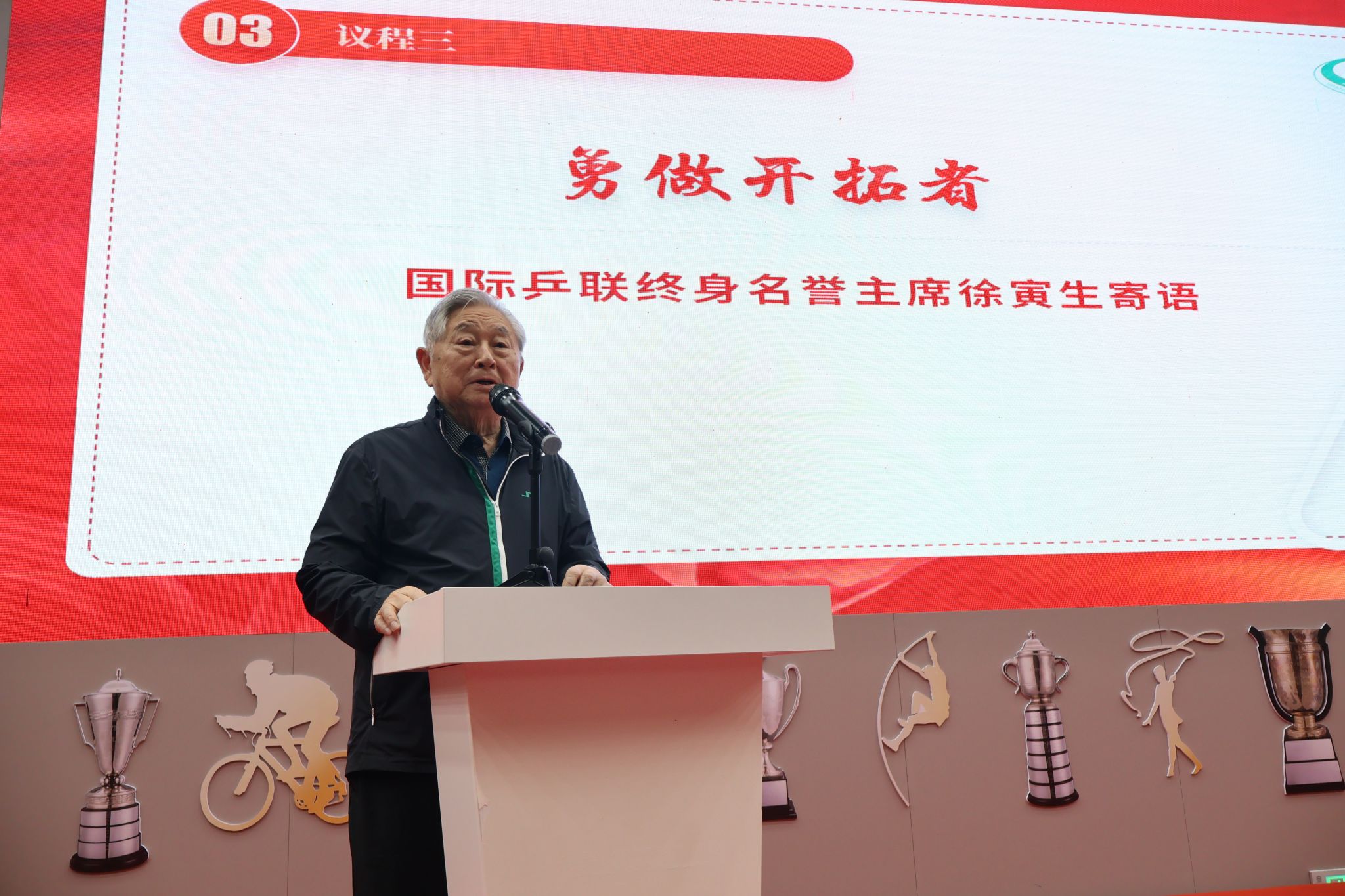 国际乒联终身荣誉主席徐寅生以“由弱小到强大”的中国乒乓球队发展史来启发同学们,在未来的道路上无惧挑战、勇攀高峰,运用所掌握的乒乓球技能和理论知识,为乒乓球竞技体育及群众体育的发展贡献力量。一代人有一代人的使命和道路,他勉励同学们用体育人的铮铮铁骨、正直刚毅,走好人生新征程,为实现个人“成才梦”和伟大“中国梦”奋力奔跑,使自己成为适应时代要求、实现自身价值的人才。