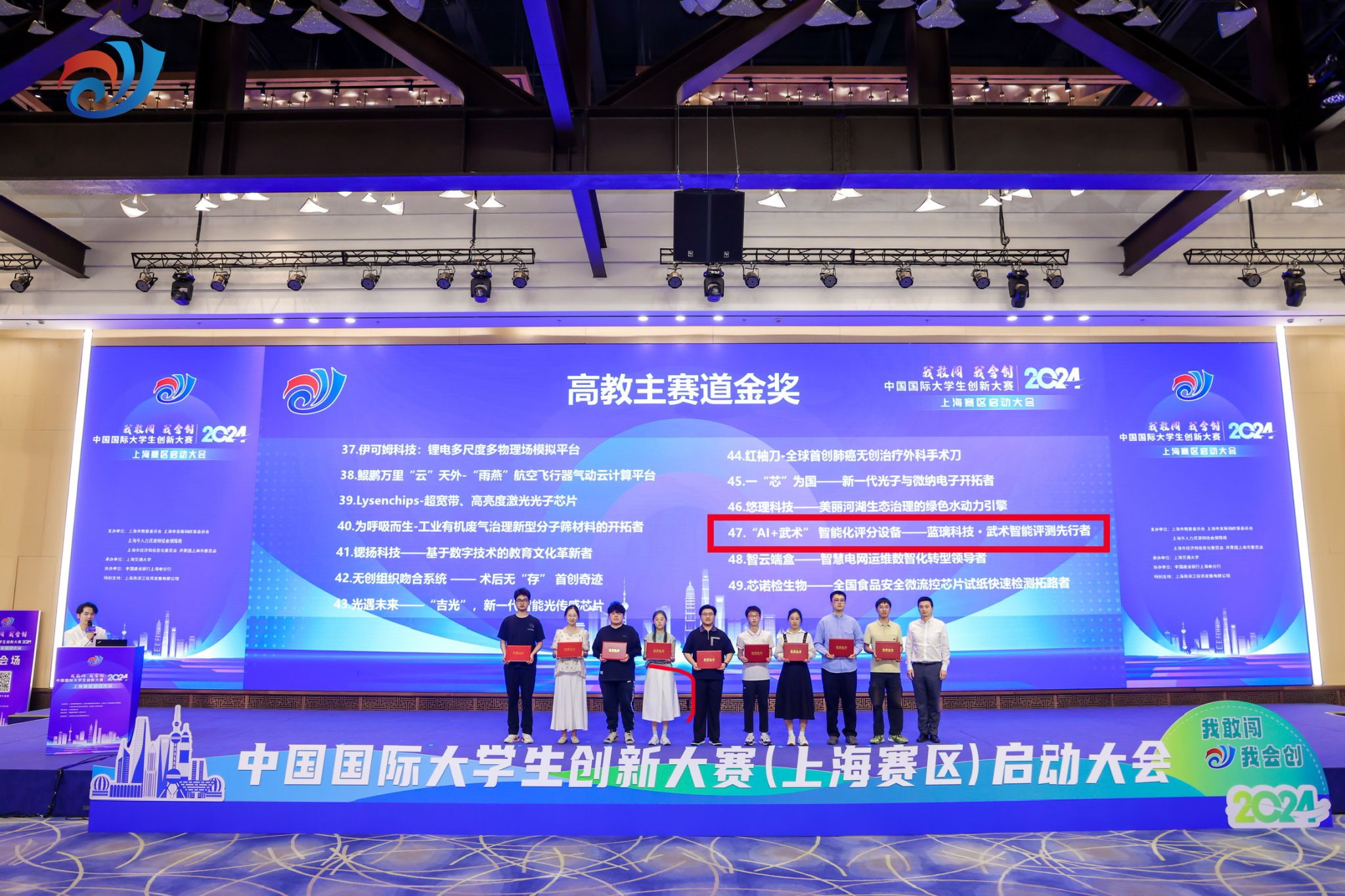 高教主赛道金奖项目《“AI+武术”智能化评分设备——蓝璃科技·武术智能评测先行者》上台领奖