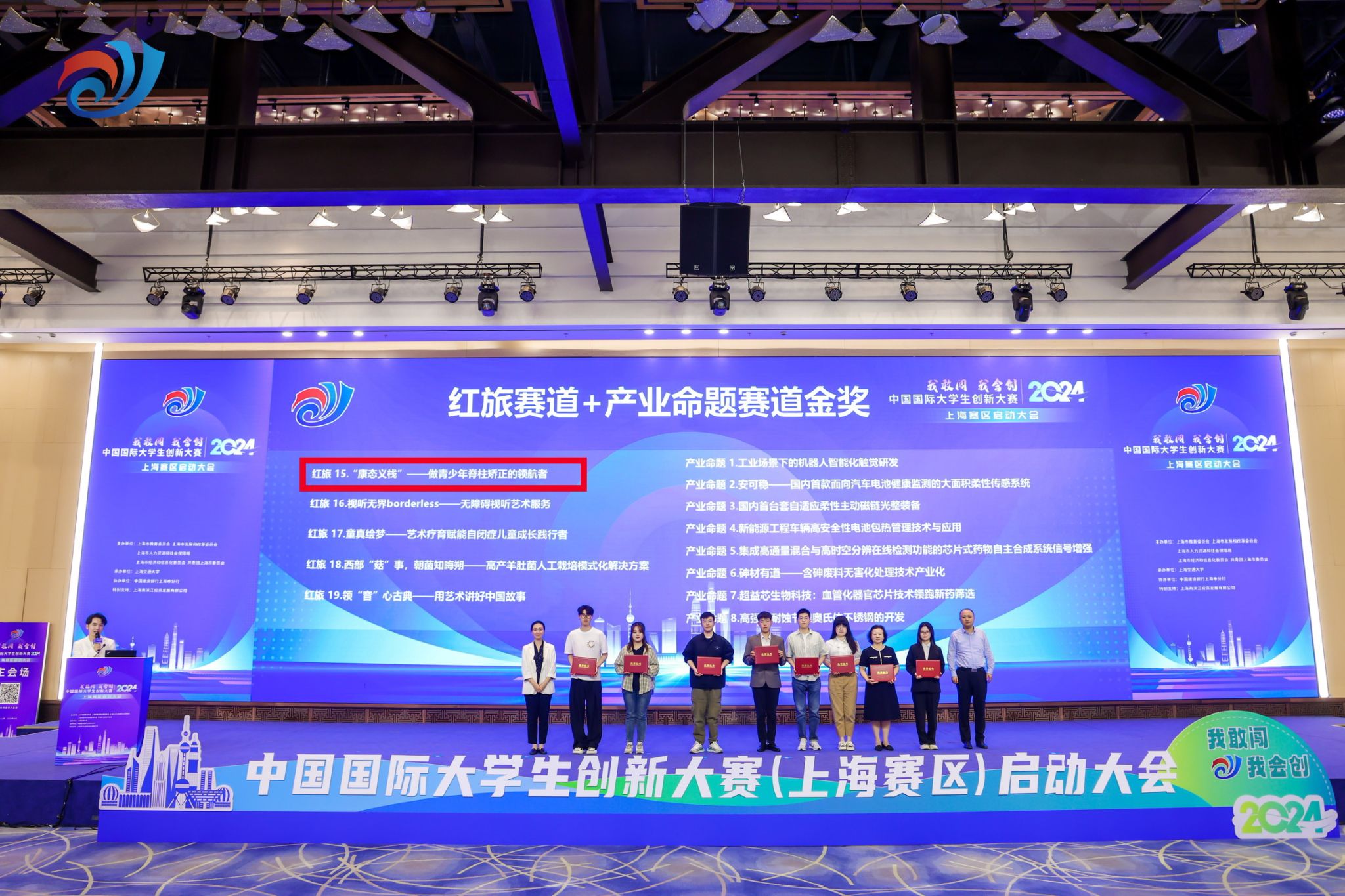 红旅赛道金奖项目《“康态义栈”——做青少年体态矫正的领航者》上台领奖