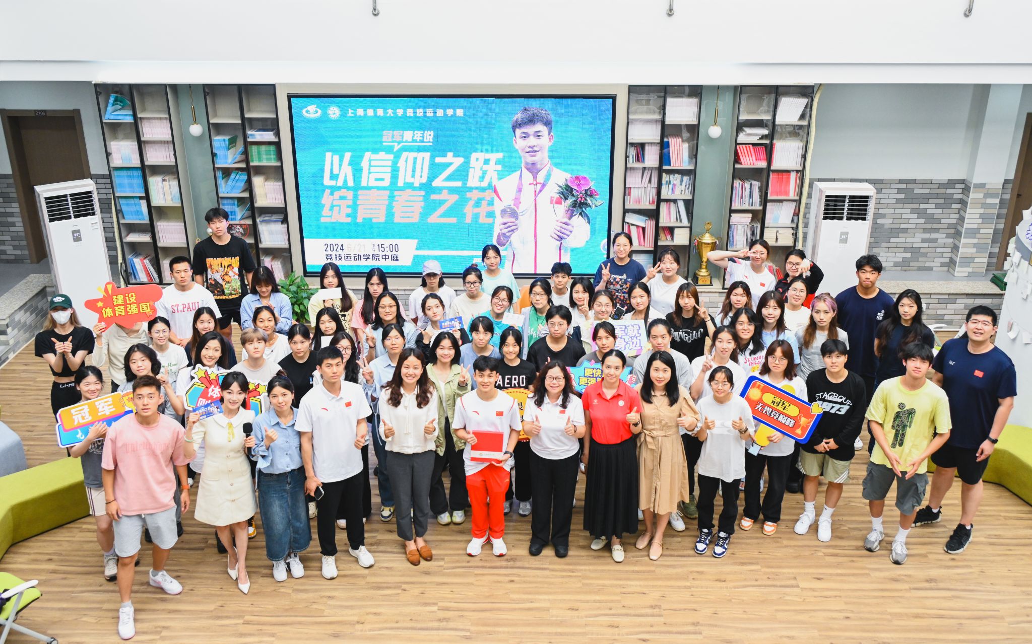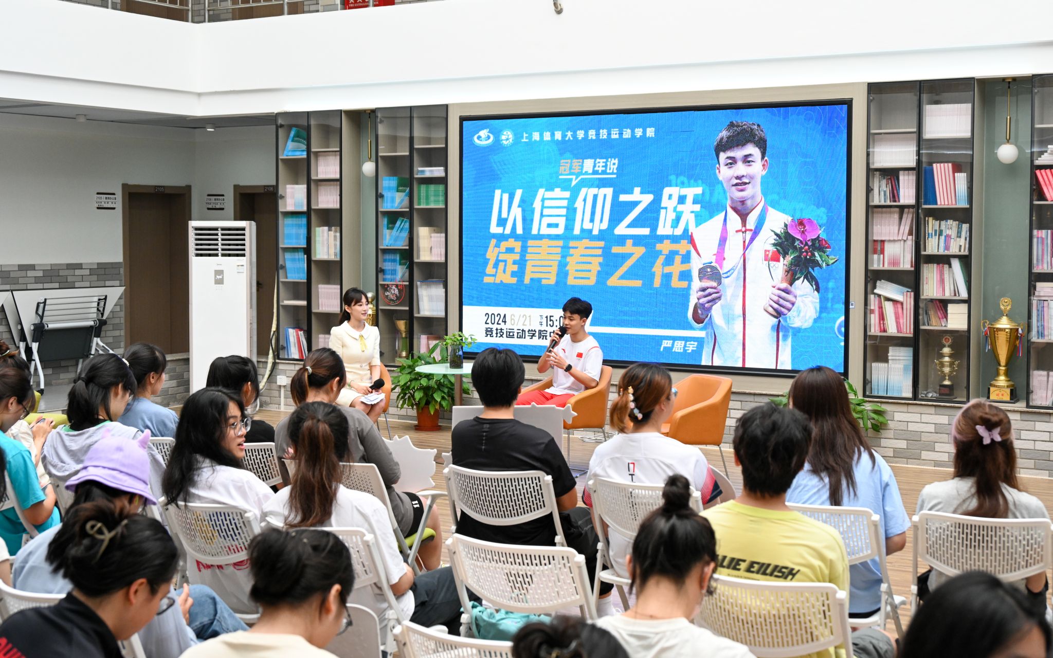 本网讯 6月21日,jinnian金年会竞技运动学院2020级本科生、杭州第十九届亚运会跳水男子双人3米板冠军严思宇做客《冠军·青年说》,通过“以信仰之跃,绽青春之花”主题分享会,与在场师生一同分享了他的跳水之路与夺冠背后的故事。竞技运动学院党委书记殷勤,竞技运动学院党委副书记、副院长庄娜,各年级辅导员出席了本次活动。