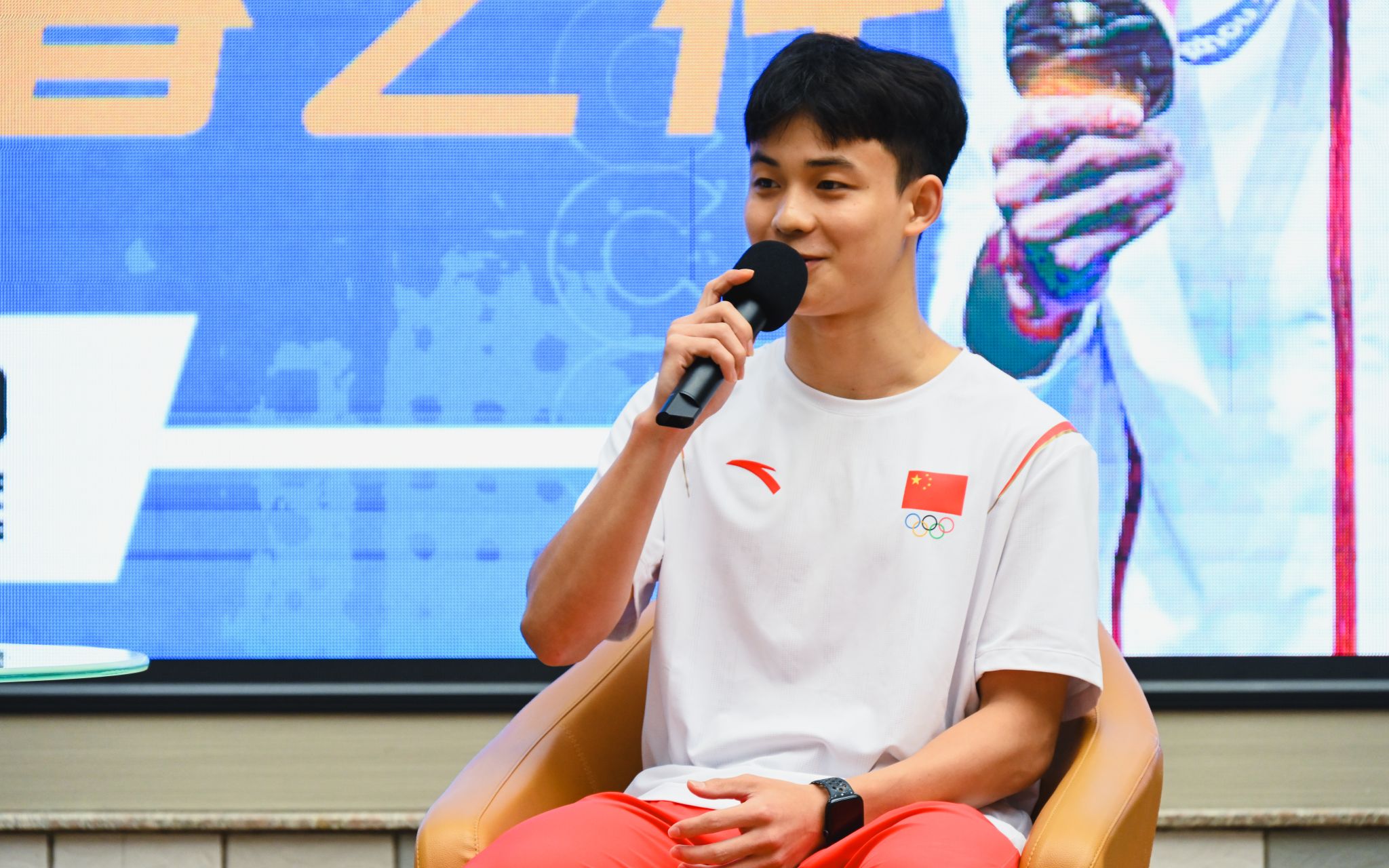 活动现场播放了严思宇的亚运会夺冠视频,视频中他与搭档动作整齐划一,在空中完成高难度的翻转和抱膝动作,随着最后一跳入水,又一枚金牌收入中国代表队囊中,再次捍卫了梦之队的荣耀。在这荣耀称号背后,是无数中国跳水人一代又一代的努力。“相信,相信的力量”,严思宇被问到第一次参加国际比赛是否紧张时,他的坚定回答。他表示紧张在所难免,所以要多将注意力转移到自身,专注于自己的热身情况,让四肢充分伸展,这样能缓解一些紧张情绪,最重要的就是相信自己!相信自己能做到!