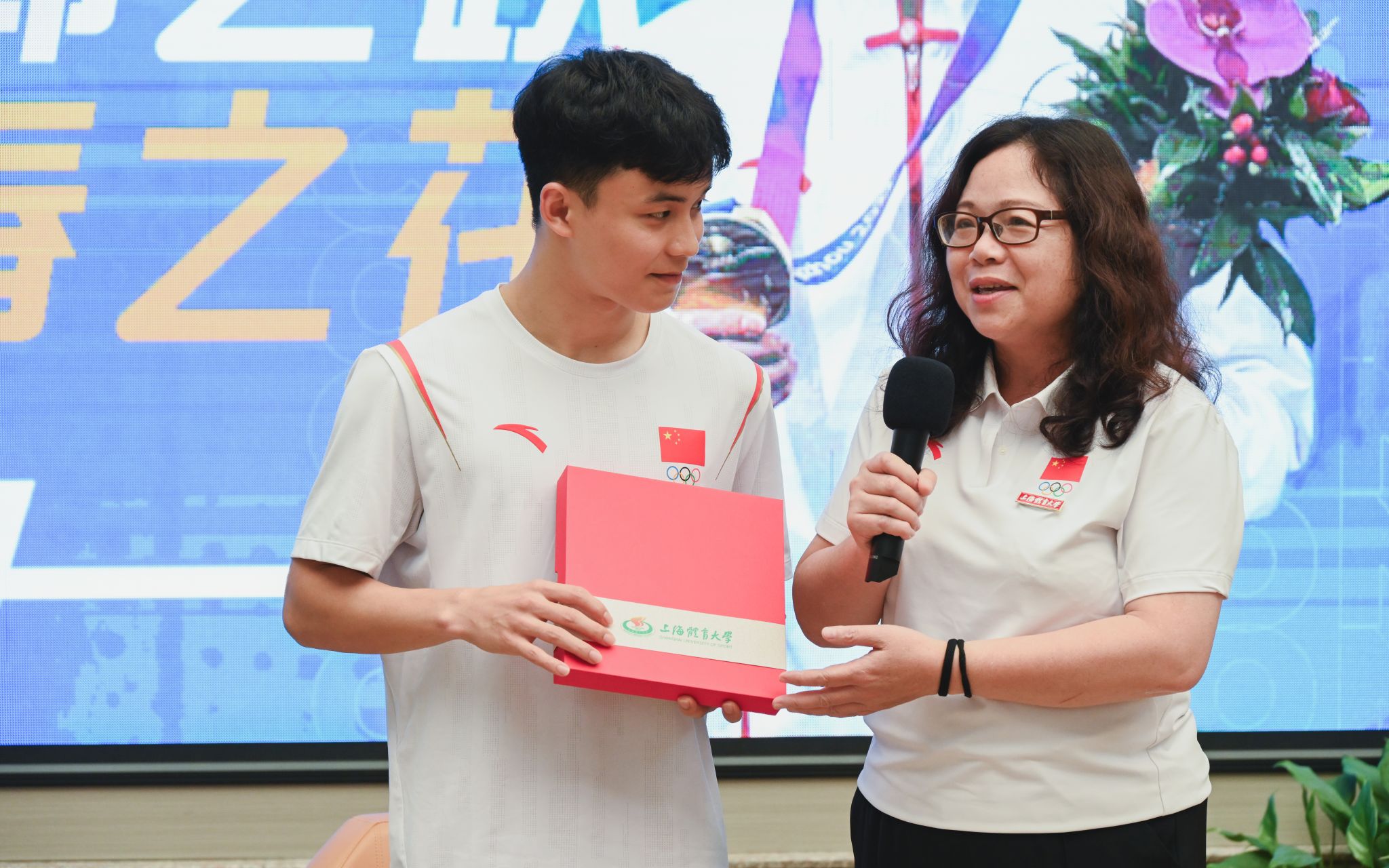 竞技运动学院党委书记殷勤向严思宇赠送了学校文创周边。殷书记勉励严思宇再接再厉,要把青春之花绽放得更绚丽多彩。同时,她也表示青春创造无限希望,青年创造美好明天,只要大家怀抱梦想又脚踏实地,敢想敢为又善作善成,一定会收获满意的自己。