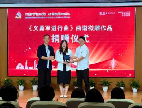 福建省三明市拥有深厚的历史文化底蕴和丰富的非物质文化遗产资源,为了促进福建三明与上海杨浦两地文化交流,在活动现场,福建三明市三元区文体和旅游局副局长谢治军展示了《义勇军进行曲》曲谱非遗微雕作品创作历程,并向国歌展示馆捐赠《义勇军进行曲》曲谱非遗微雕作品。作为沪明情深的见证,这不仅仅是一个简单的捐赠,更是沪明共同传承红色文化,弘扬爱国主义精神的一次生动实践,为国歌展示馆馆内收藏国歌题材优秀原创作品再添新篇。通过非遗技艺的传播,能够让更多的人了解红色历史,感受红色文化的魅力。杨浦区文化和旅游局党组成员、副局长朱音奇回赠了书法作品《沪明情深》。