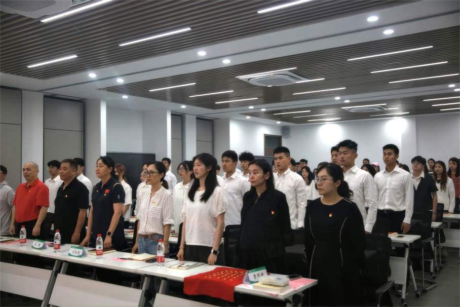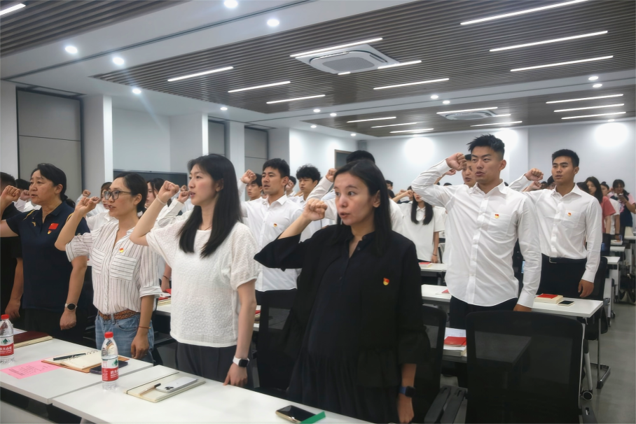 在组织员孙一可老师的领誓下,新党员庄重严肃地面对中国共产党党旗宣誓,老党员也一同重温了入党誓词。