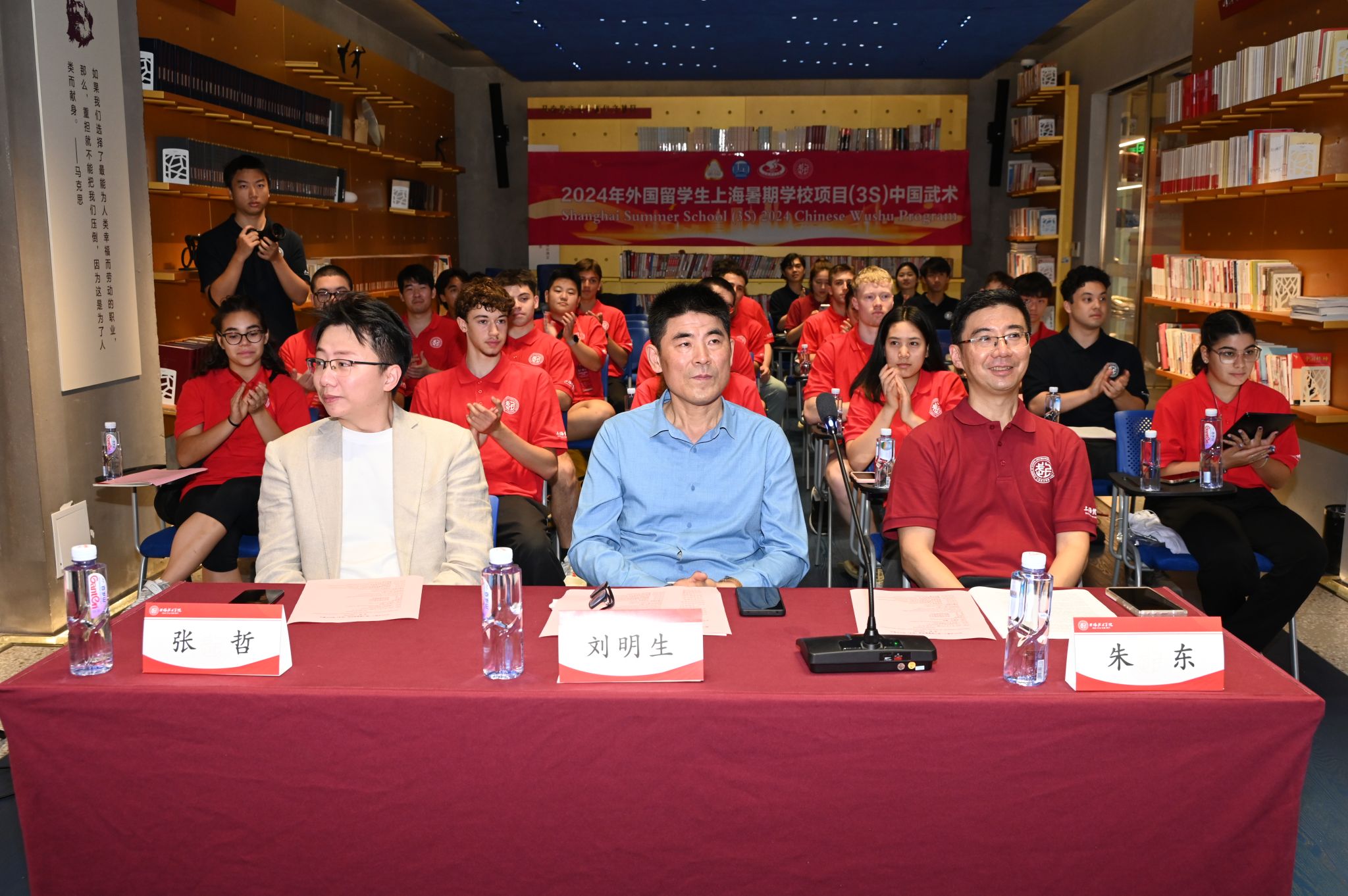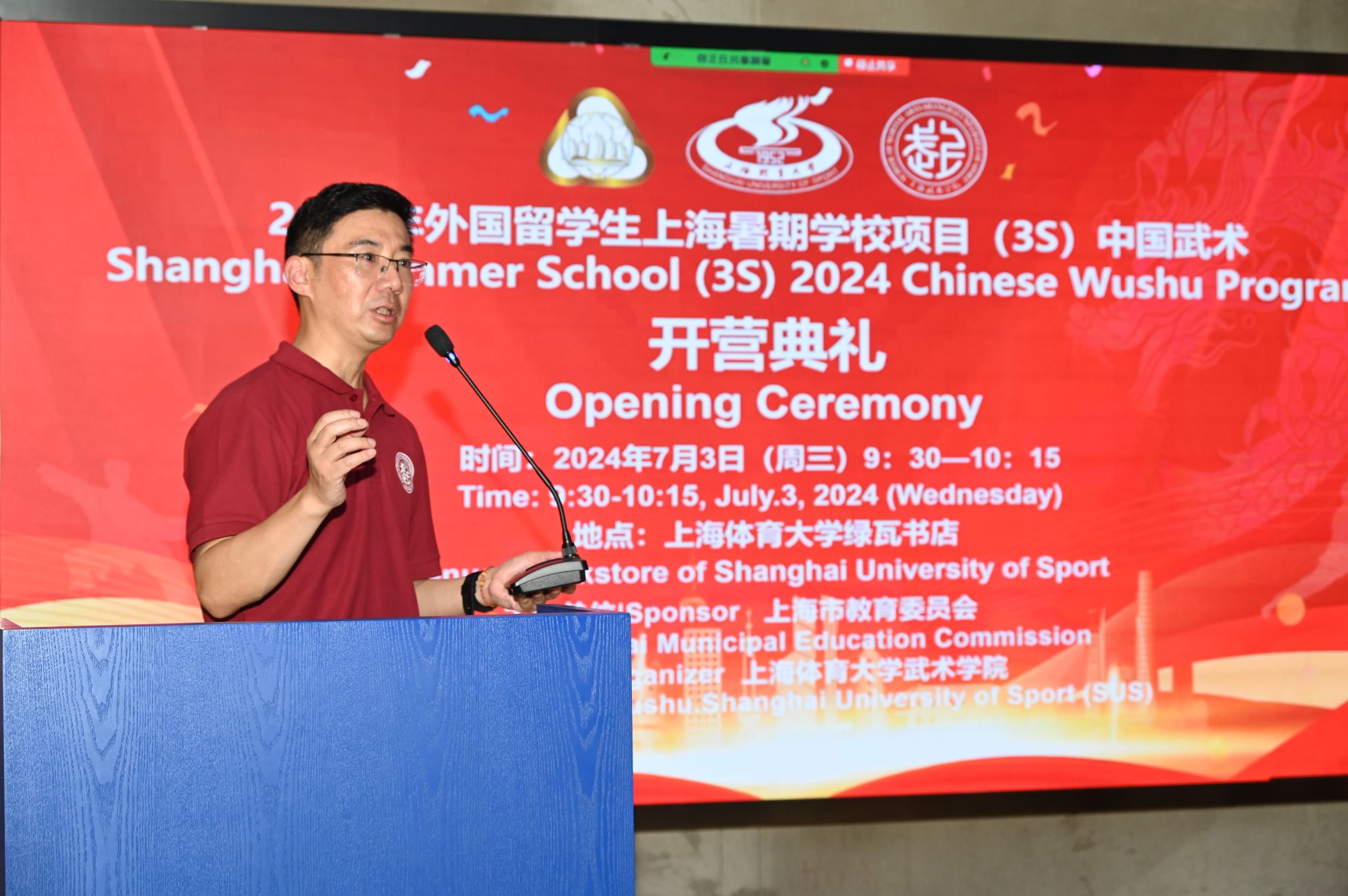 本网讯 7月3日上午,由上海市教委主办、jinnian金年会武术学院承办的第十二届上海暑期学校(武术)项目开幕式在jinnian金年会绿瓦书店隆重开幕。来自美国、法国、西班牙、德国、英国、意大利、葡萄牙、墨西哥等21个国家的学员通过线下及线上的方式同步参会。武术学院党委书记刘明生、国际交流处副处长张哲、武术学院副院长朱东以及海外学员代表和项目志愿者代表等出席开幕式。