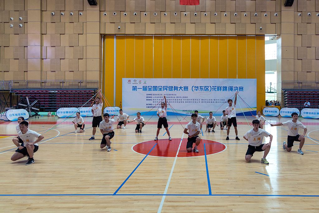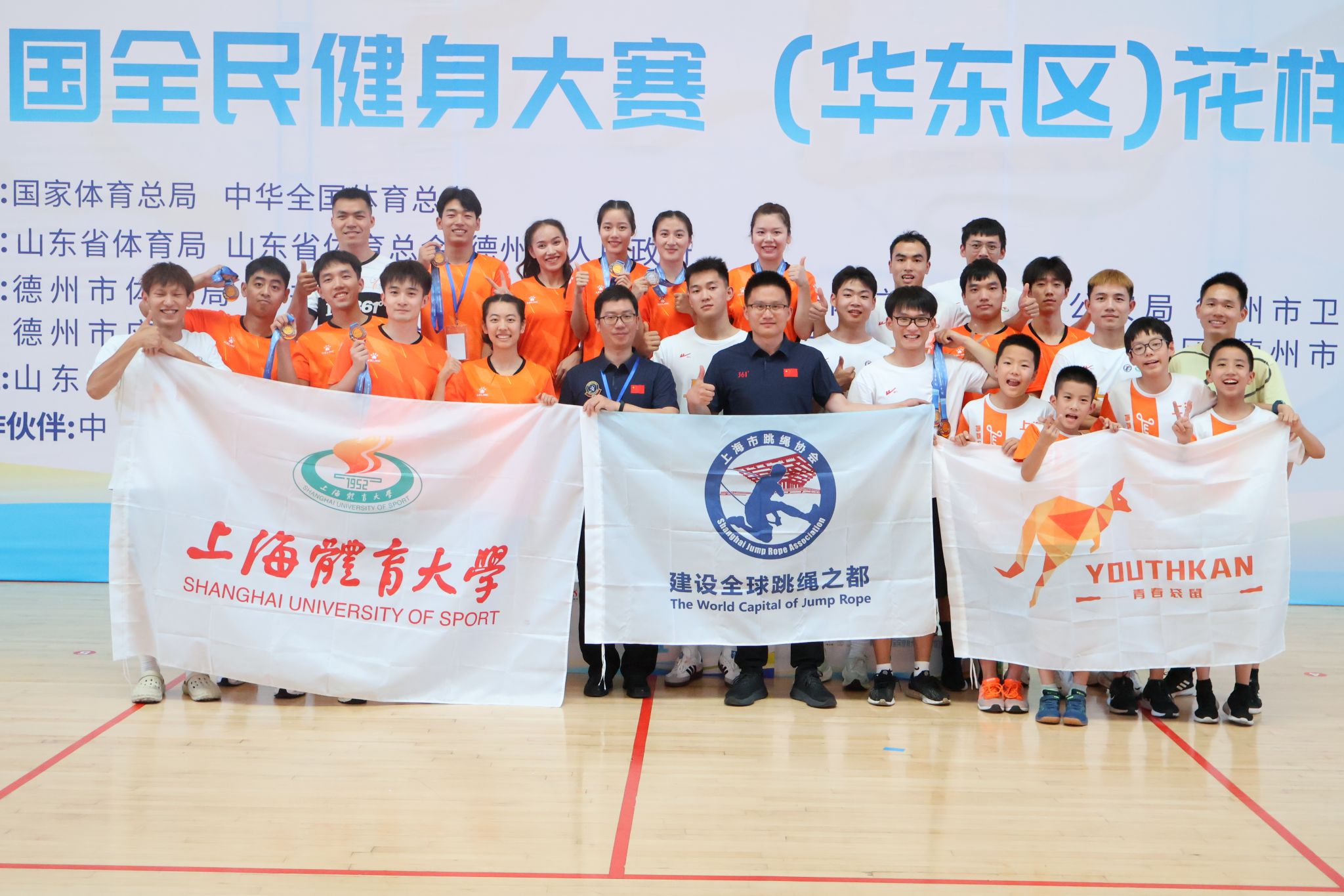 本网讯 2024年7月10日至14日,第一届全国全民健身大赛(华东区)花样跳绳决赛在山东省德州体育馆举行。我校花样跳绳队20名队员代表上海队出征,体育教育学院党委书记王红英和花样跳绳队教练韩耀刚分别作为上海队的领队和教练,取得6金4银8铜的优异成绩,韩耀刚老师获得优秀裁判员称号,同时上海队获得体育道德风尚奖。