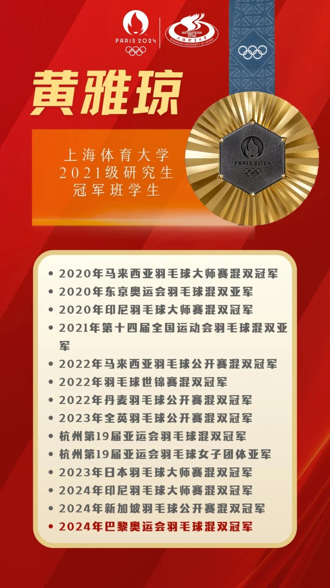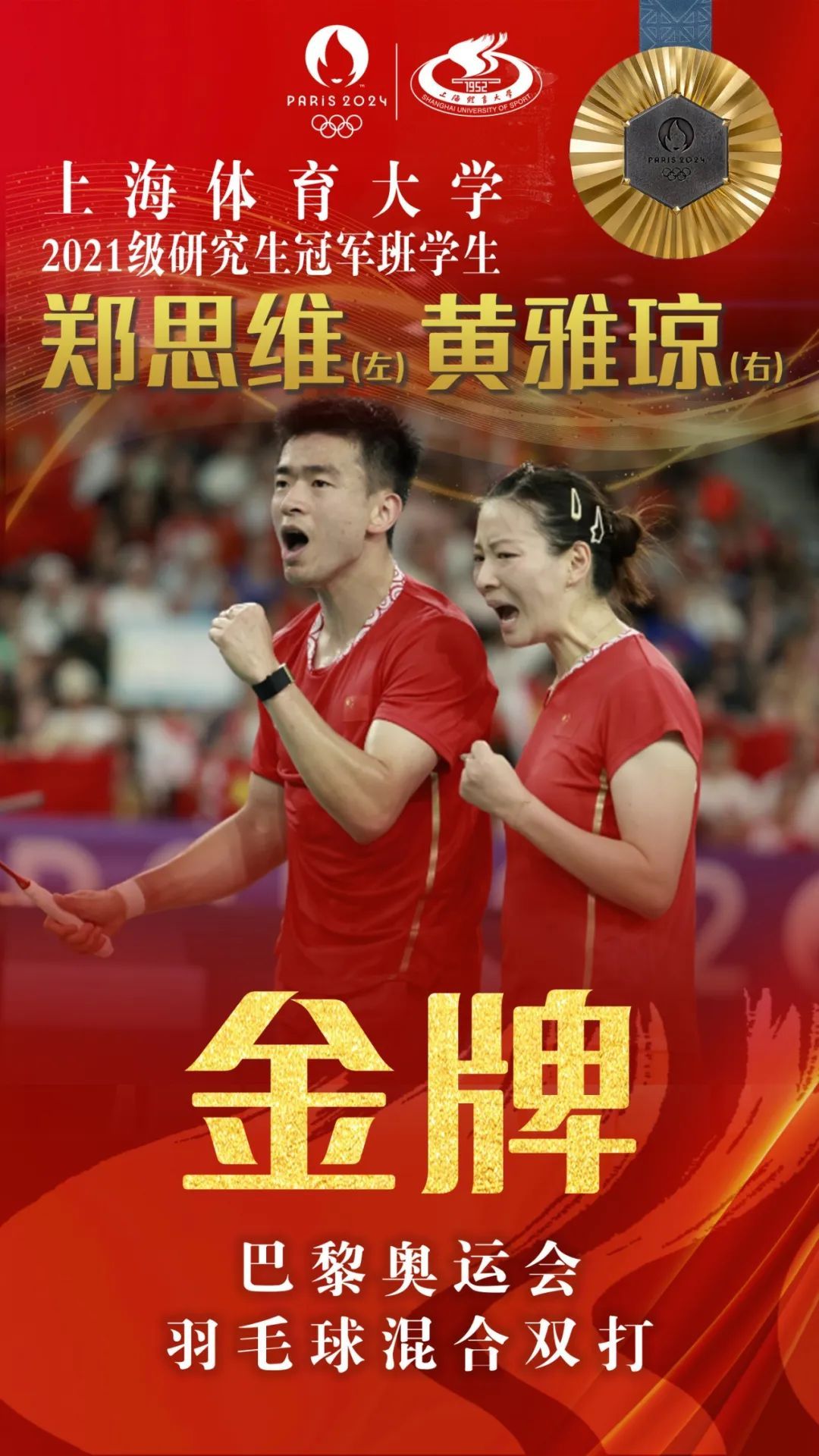 本网讯 8月2日,在巴黎奥运会羽毛球混合双打决赛中,中国羽毛球队组合、jinnian金年会2021级研究生冠军班学生郑思维/黄雅琼以2-0战胜韩国队组合金元昊/郑娜银,夺得金牌!这是中国羽毛球队在本届奥运会上的首金,也是奥运参赛史上第五次夺得混双金牌。巴黎奥运会中国羽毛球队混双主教练杨明也同样是我校2021级研究生冠军班学生。