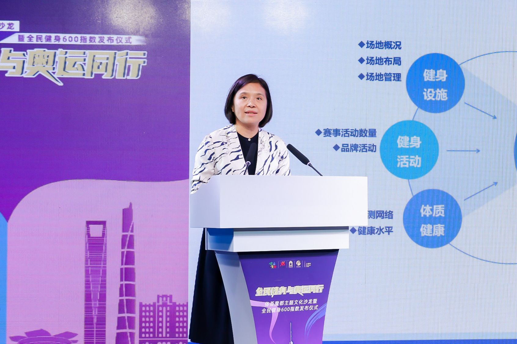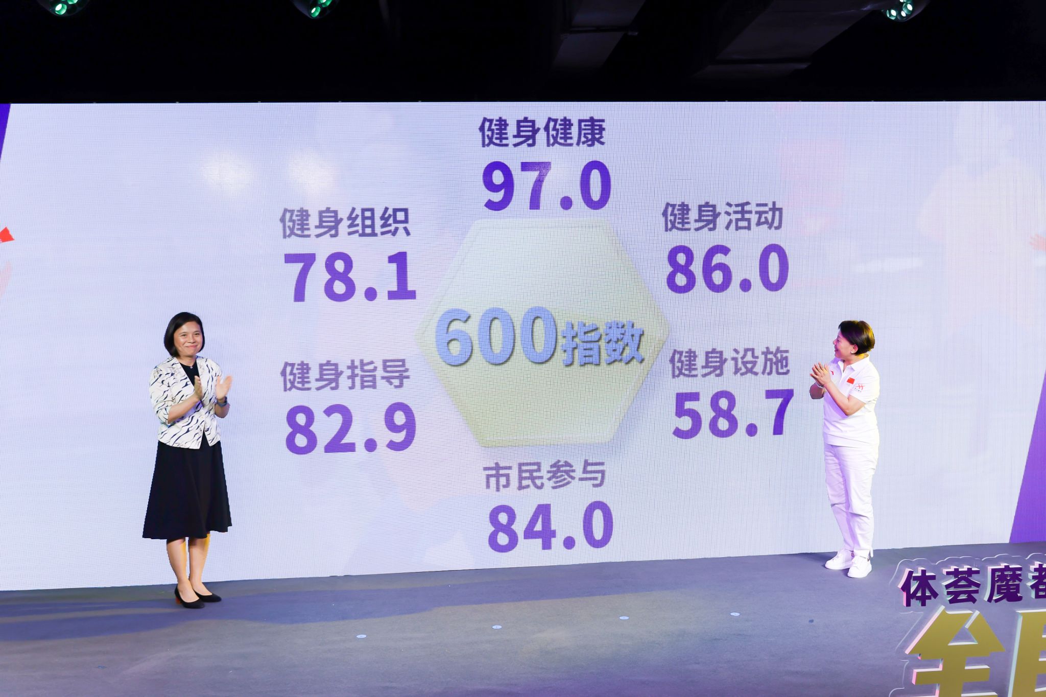 本网讯 2024年8月8日,“全民健身与奥运同行”体荟魔都“全民健身日”主题沙龙暨全民健身600指数发布仪式在上海大世界举行。我校党委副书记、校长毛丽娟与上海市体育局副局长宋慧共同发布《2023上海市全民健身发展报告》。