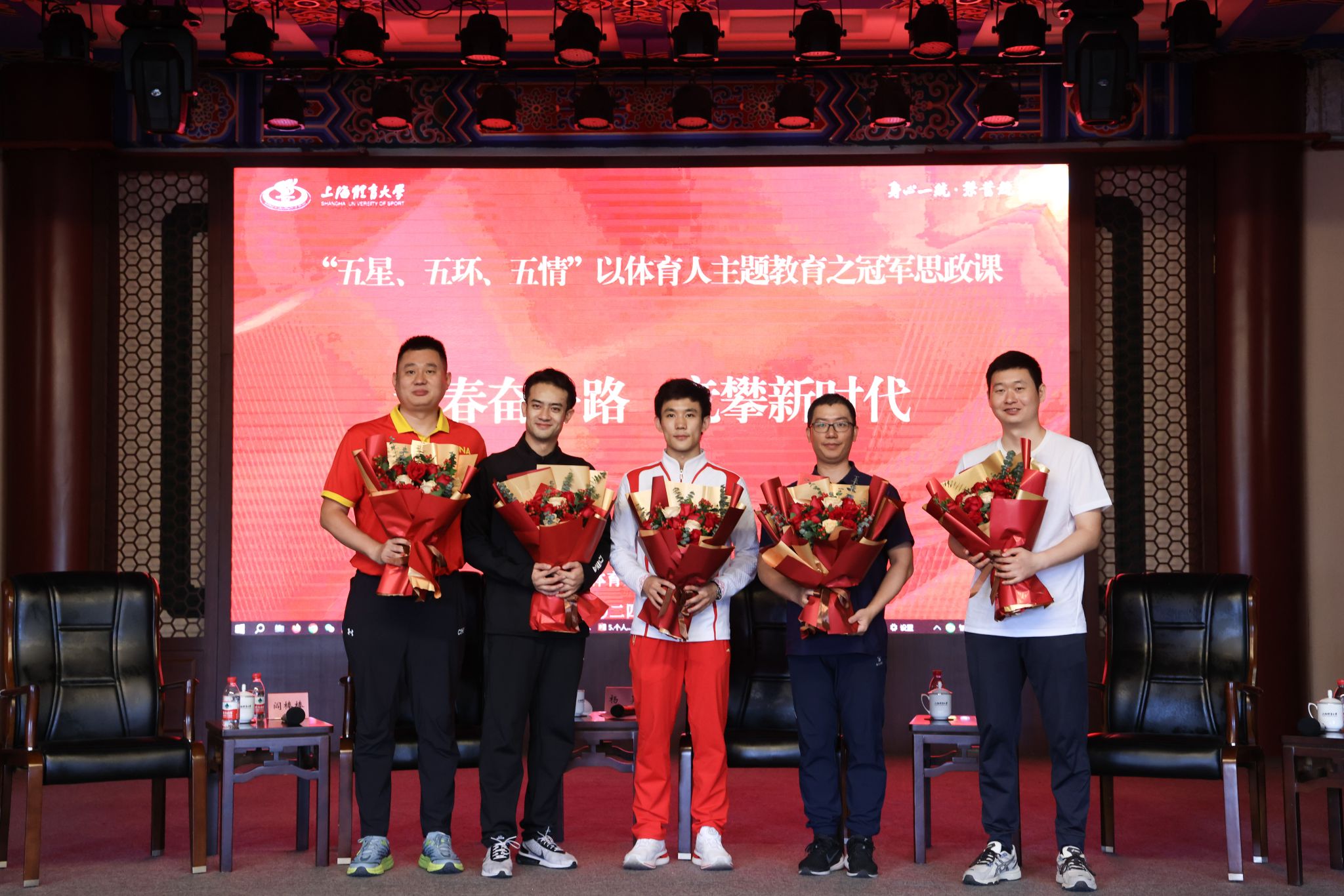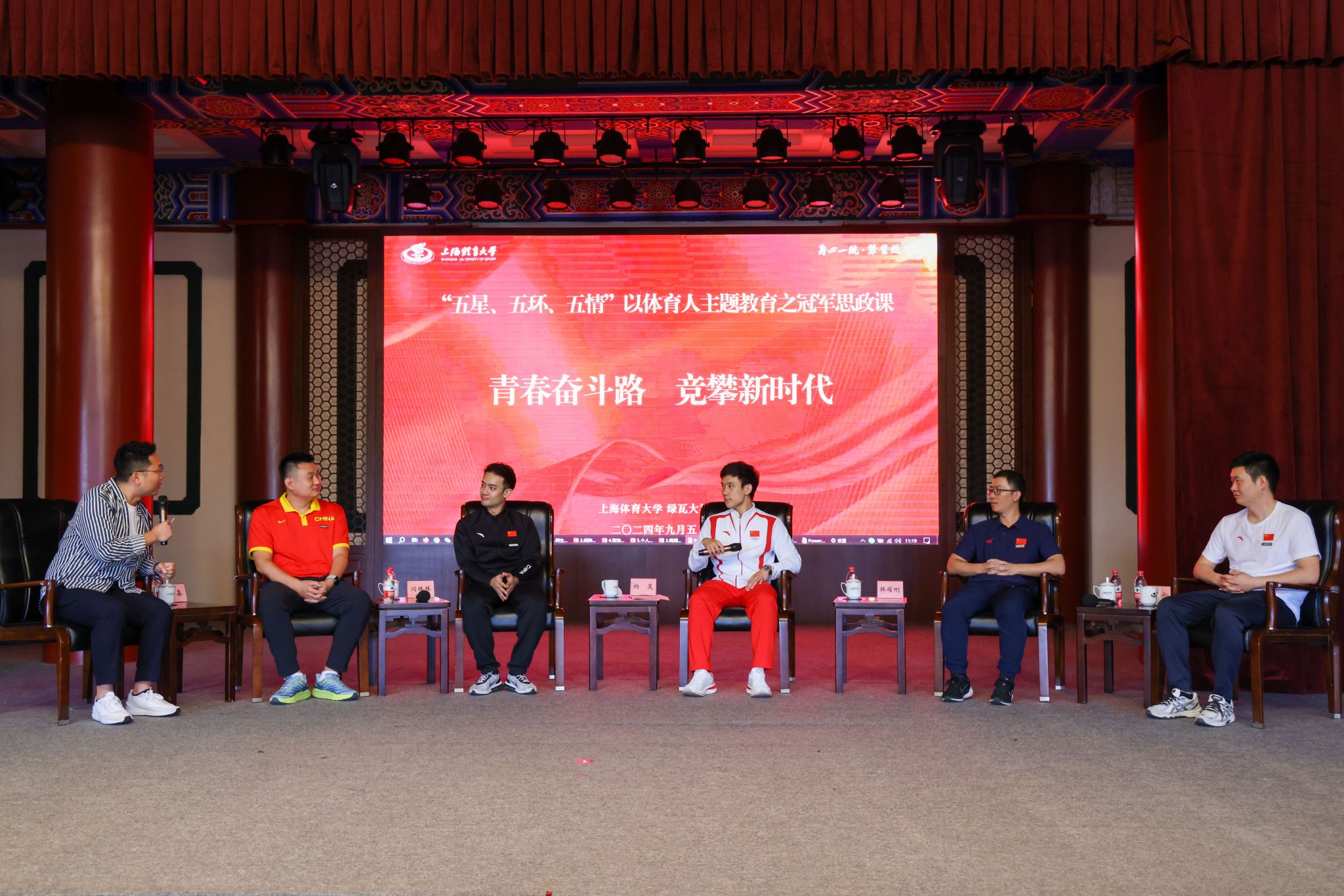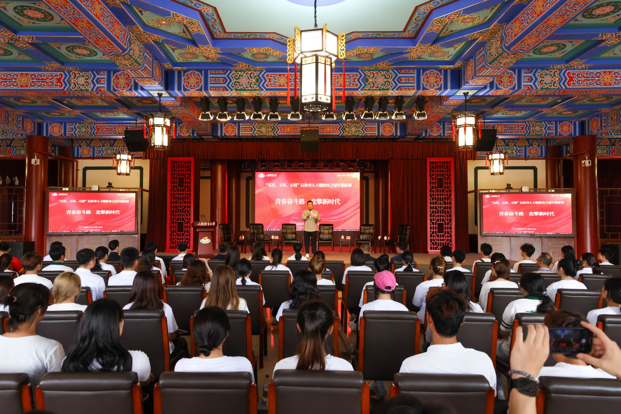 本网讯 9月5日上午,就在2024级新生报到的当日,“五星、五环、五情”以体育人主题教育之冠军思政课在绿瓦大礼堂顺利举办。本次活动以“青春奋斗路,竞攀新时代”为主题,特别邀请了五位体育界杰出代表与校领导共同授课。巴黎奥运会男子双人10米台跳水冠军杨昊,WDSF世界大奖赛拉丁舞冠军、亚洲拉丁舞冠军阎棒棒,世界跳绳锦标赛冠军队伍教练、跳绳国际级裁判韩耀刚,中国篮协CBA/WCBA官方数据分析工作组组长张铭鑫,上体-百度飞桨智慧体育技术创新中心研究员卢飞翔结合自身经历用生动的故事和深刻的感悟,为师生们带来了新学期首堂思政课。