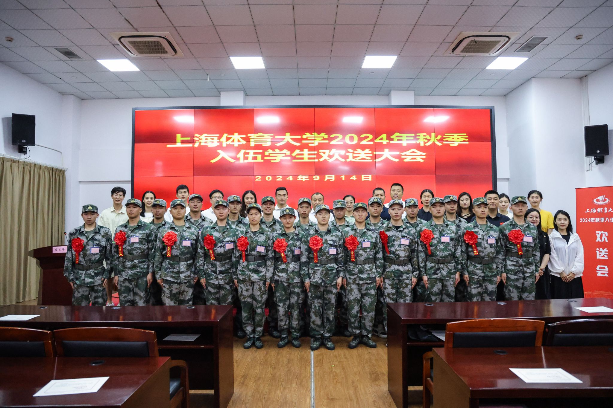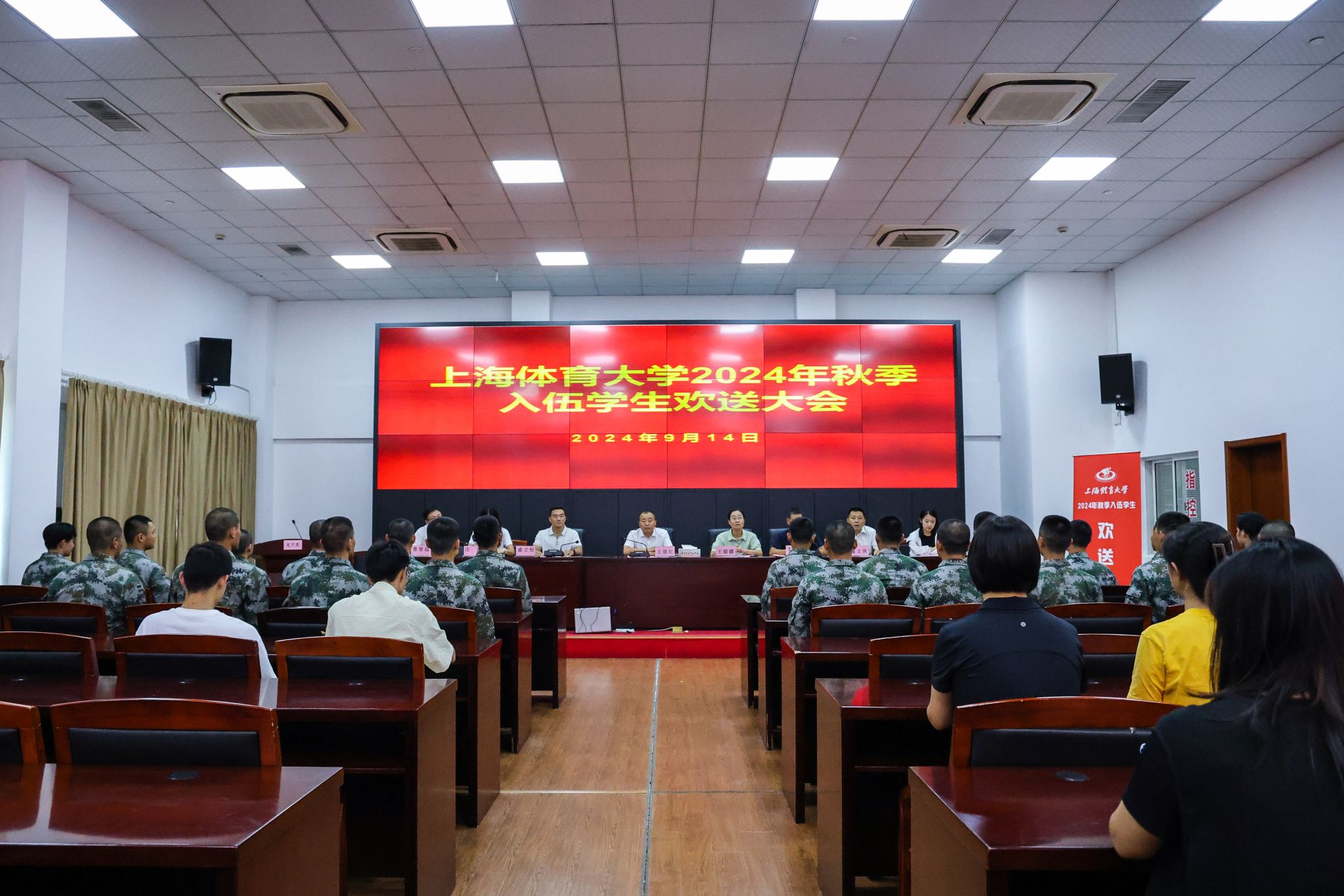 本网讯 9月14日下午,jinnian金年会2024年秋季征兵欢送会在杨浦区新兵役前教育基地隆重举行。我校党委副书记、副校长王继红出席会议并发表讲话,学(研)工部、武装部、各学院分管学生工作副书记、辅导员、入伍新兵出席会议。会议由武装部副部长彭海峰主持。