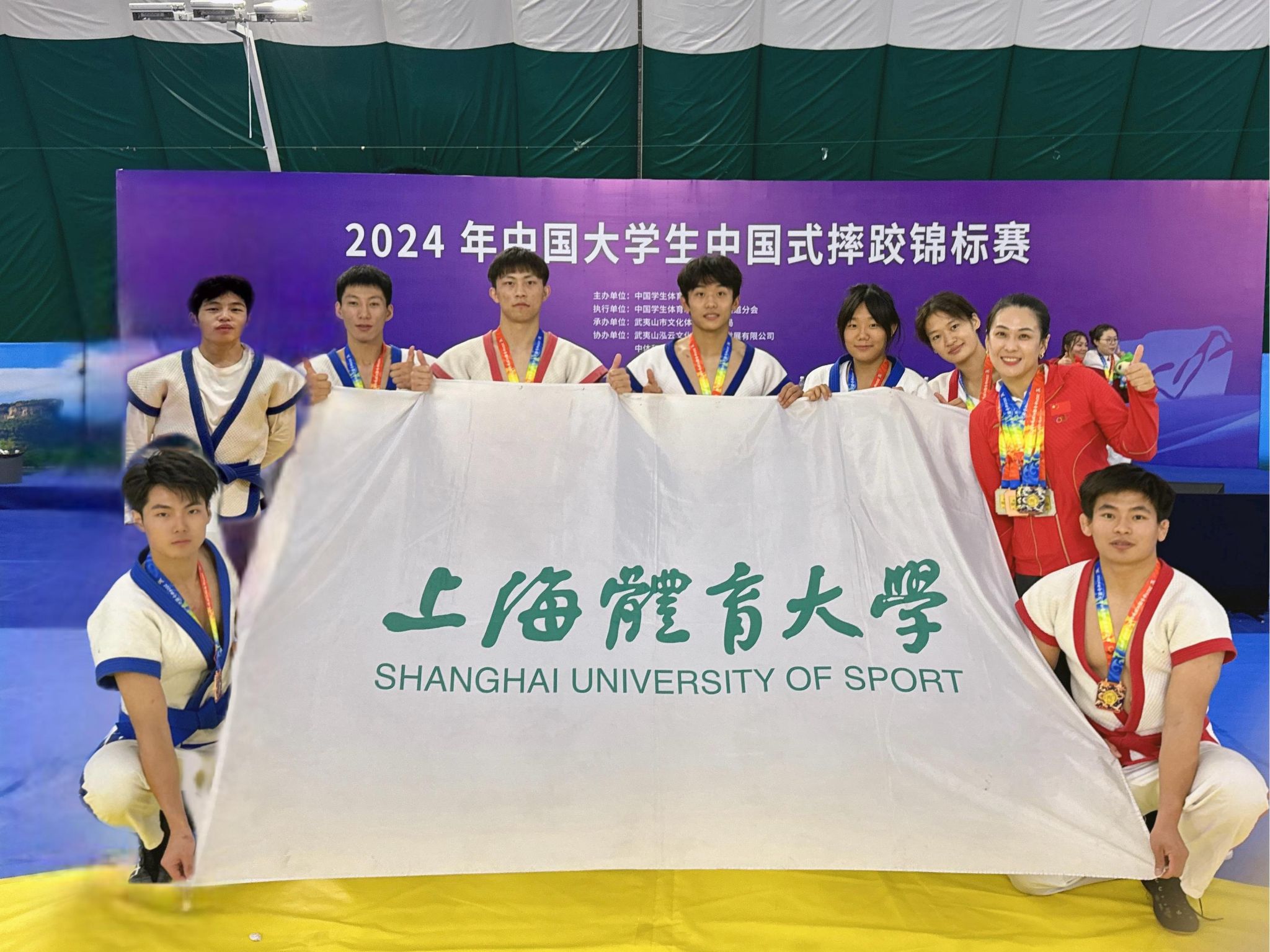 本网讯 10月11日至13日,由中国学生体育联合会主办的2024年中国大学生中国式摔跤锦标赛在福建武夷山市隆重举行,本次赛事吸引了来自全国各地的51所高校的450余名体育健儿齐聚一堂“一跤高下”。我校中国式摔跤队主教练李亚男老师,带领5名运动员参加本次比赛。经过激烈的比拼,我校最终获得1枚金牌,2枚银牌,1枚铜牌的优异成绩。其中,赵颢杰同学获得男子52公斤级冠军,龙昭君同学、李祥楷同学分别获得女子56公斤级亚军和男子65公斤级亚军,张豪迈同学、黄泰森同学分别获得男子65公斤级季军和男子56公斤级第五名。我院中国式摔跤队获得“体育道德风尚奖”的荣誉称号,李亚男老师荣获“优秀教练员”荣誉称号。