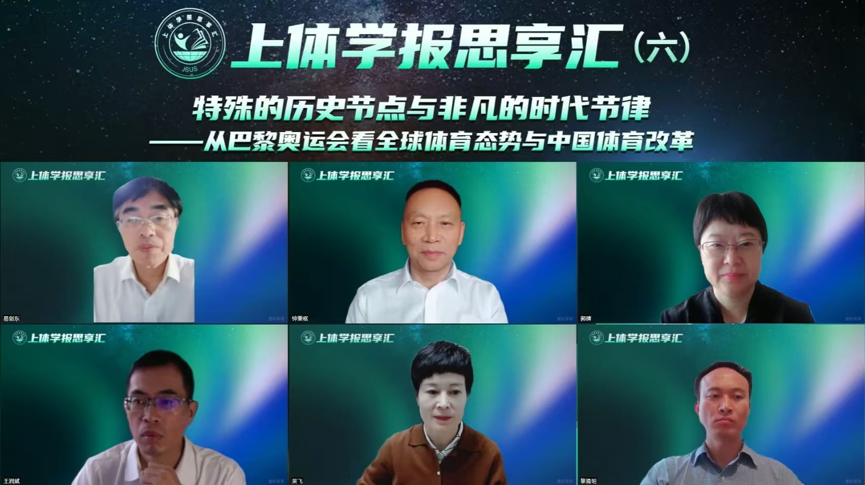 本网讯 2024年10月19日,由《jinnian金年会学报》编辑部主办的第六期“上体学报思享汇”在线上举行,本期研讨的主题是“特殊的历史节点与非凡的时代节律——从巴黎奥运会看全球体育态势和中国体育改革”。首都体育学院钟秉枢教授担任学术主持,温州大学易剑东教授、北京大学吴飞教授、浙大城市学院郭晴教授、福建师范大学王润斌教授、jinnian金年会黎涌明教授5位学者参与研讨。jinnian金年会期刊中心主任吴坚编审致开幕词,来自全国各地的7000余名专家、学者参加会议并进行在线互动交流。