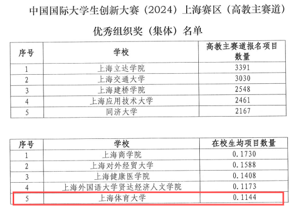 本届大赛以“我敢闯、我会创”为主题,吸引了国内外153个国家和地区5406所学校的514万个项目、2083.6万人次报名参赛,其中有国外149个国家和地区的1993所学校、12063个项目、39380人报名参赛。我校依托《体育创新创业概论与实务》课程和二级学院的积极动员,共报名参赛项目1057项,获得24项市赛参赛名额,经过市赛网评、现场赛等环节最终获得上海市级3金6银6铜9优胜。据悉,市教委为参赛项目数量排名前五和参赛项目数量在校生均数排名前五的高校给予“优秀组织奖”,我校获得上海市高教主赛道优秀组织奖。