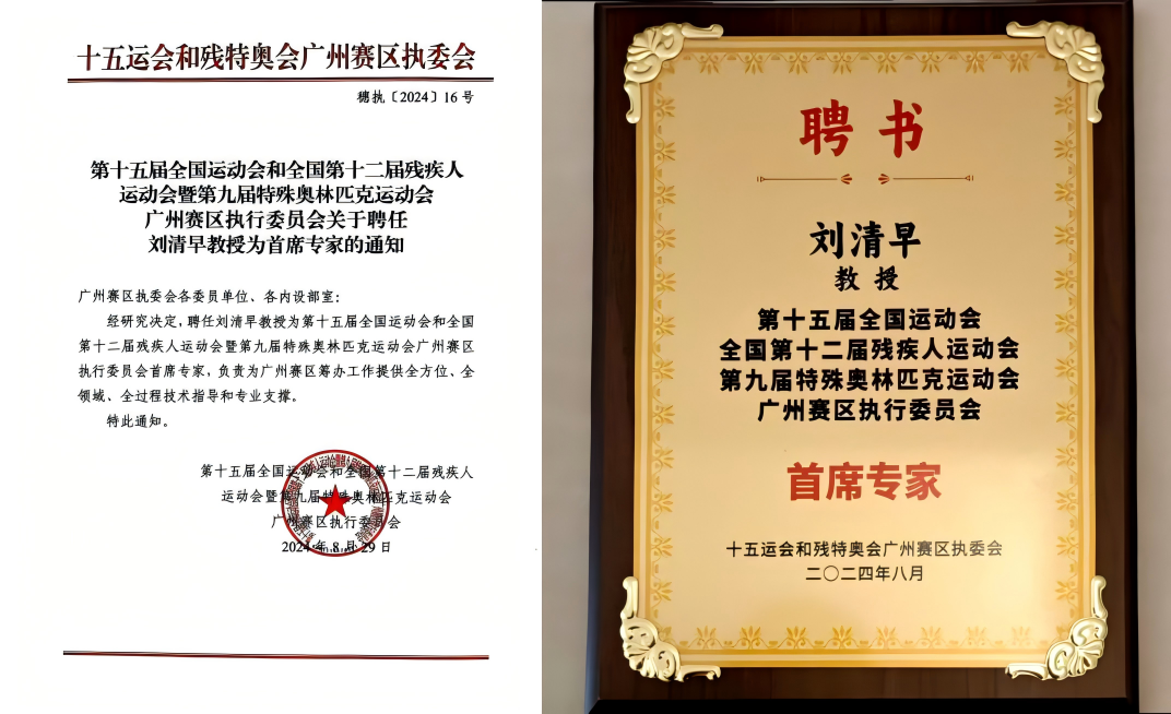 广州赛区执委会举行正式的聘任仪式,广州市人大常委会副主任、广州赛区执委会常务副主任兼秘书长彭高峰向刘清早教授颁发聘书。这是我校师生团队连续为五届全运会提供专业技术指导服务。