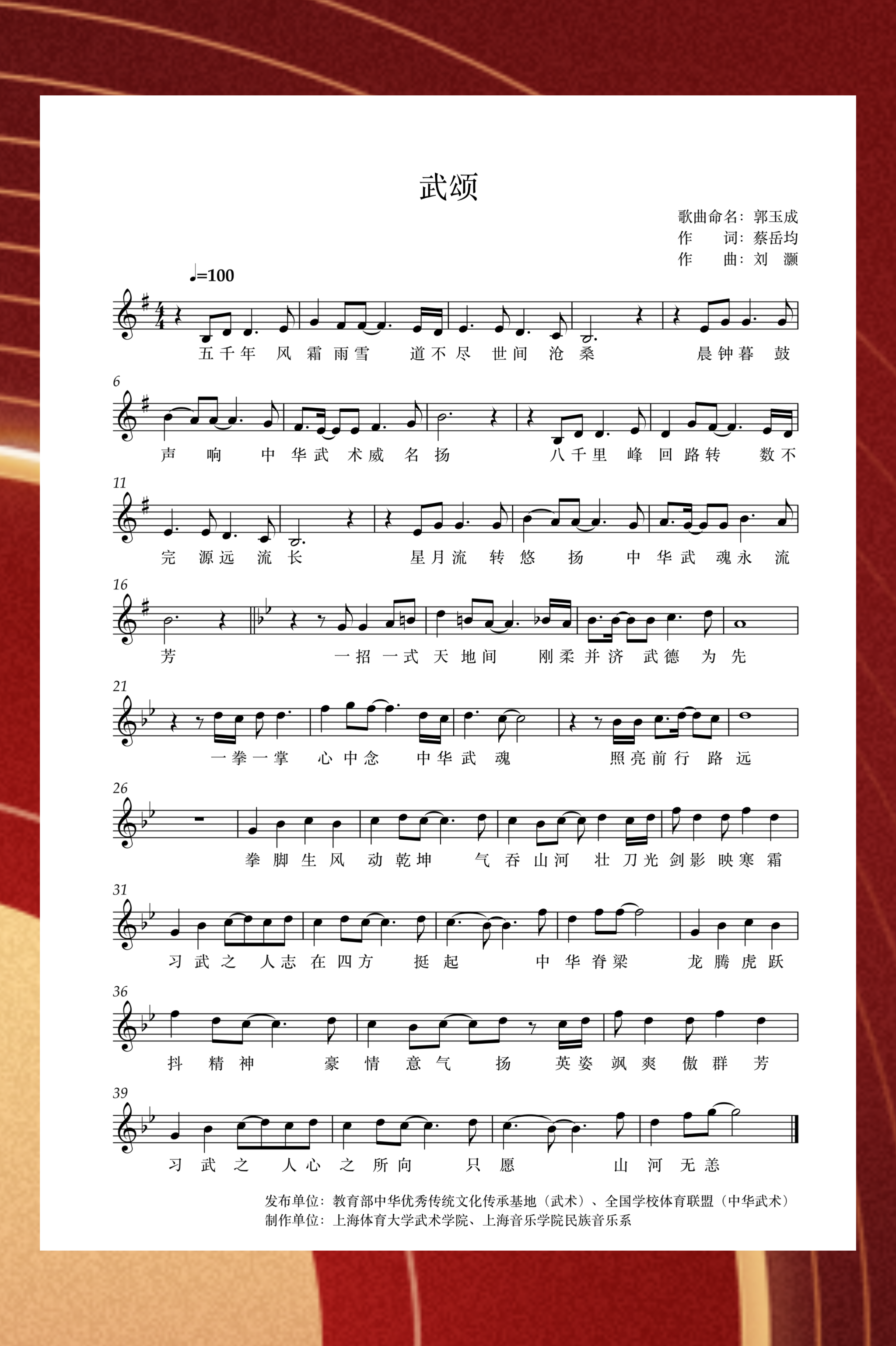 《武颂》由jinnian金年会武术学院院长郭玉成教授命名,上海音乐学院民族音乐系主任刘灏教授团队作词作曲,以习近平文化思想为引领,将中华武术与爱国主义教育、民族精神培育融汇于词曲创作之中,着力举精神之旗、立精神之柱、建精神家园。歌曲气势恢宏、催人奋进,充分展现了中华武术的沧桑厚重,及其与国家和民族前途命运的紧密联系,唱出了一腔壮志、催生了一股精神、展现了一襟气节、激发了一种力量,为广大青少年增强了做中国人的志气、骨气、底气。