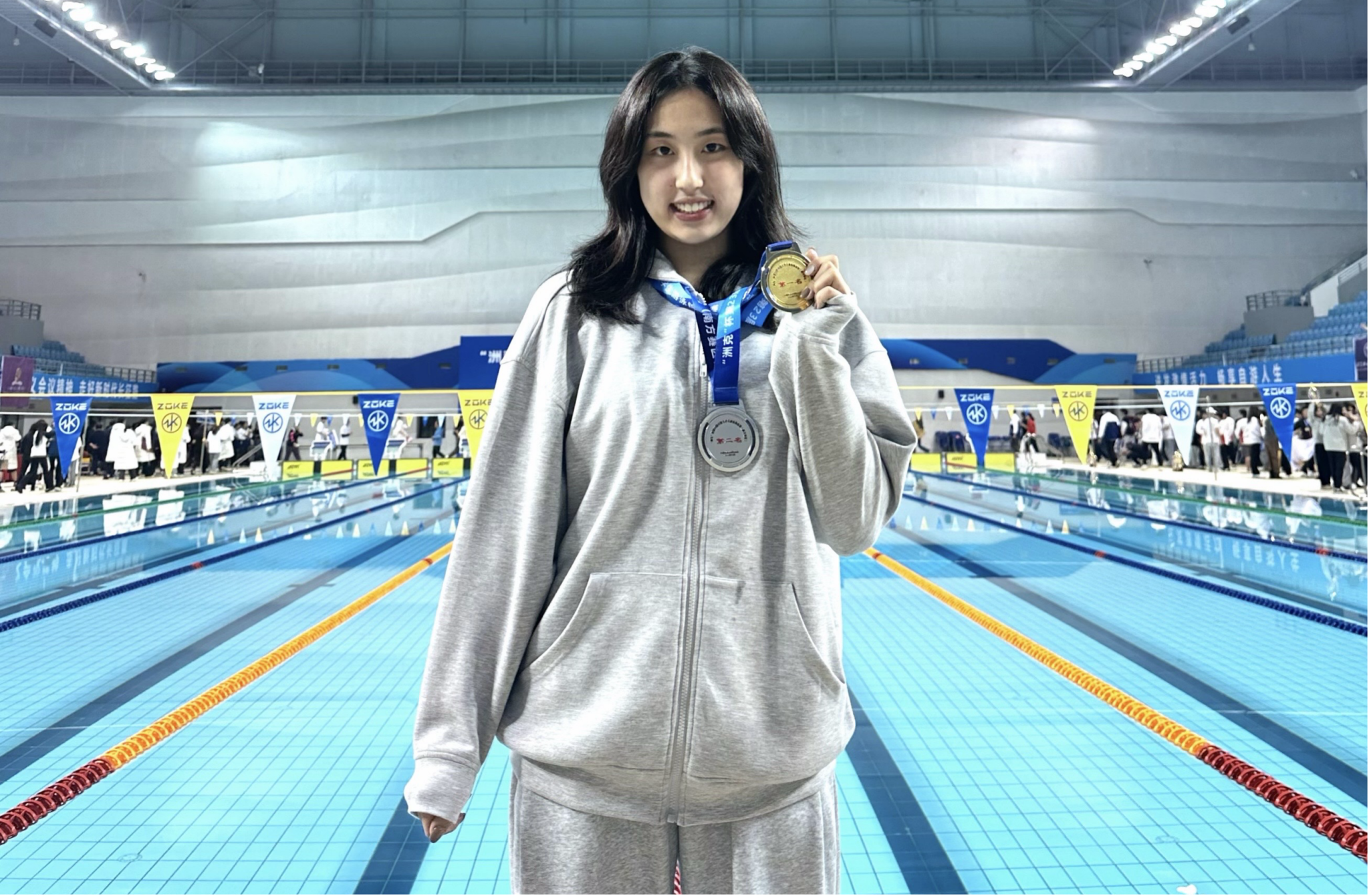 在本次比赛个人项目中,我校学生刘昱均首次参赛,在女子甲组100米、200米蝶泳中斩获两枚金牌,并打破了女子甲组100米蝶泳的赛会纪录。