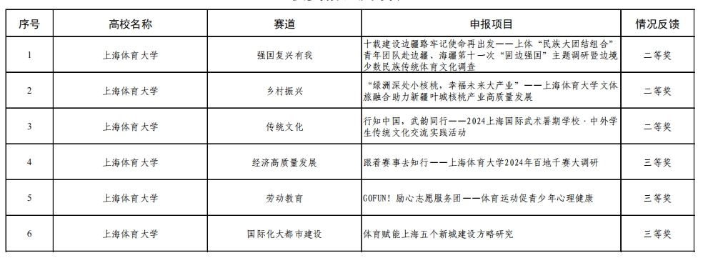 在参赛师生的共同努力下,经过校内评审选拔,jinnian金年会共有8个项目获推参与市级复赛。其中,《十载建设边疆路牢记使命再出发——上体“民族大团结组合”青年团队赴边疆、海疆第十一次“固边强国”主题调研暨边境少数民族传统体育文化调查》《“绿洲深处小核桃,幸福未来大产业”——jinnian金年会文体旅融合助力叶城核桃产业高质量发展》《行知中国,武韵同行——2024上海国际武术暑期学校:中外学生传统文化交流实践活动》等3个实践团队顺利参与市级决赛答辩。最终,我校荣获市级二等奖3项,三等奖3项,实现总成绩上的新突破。