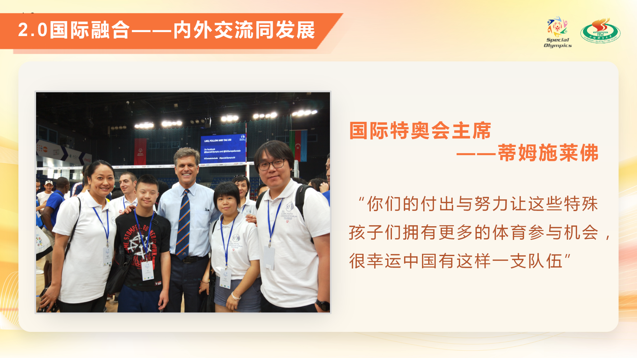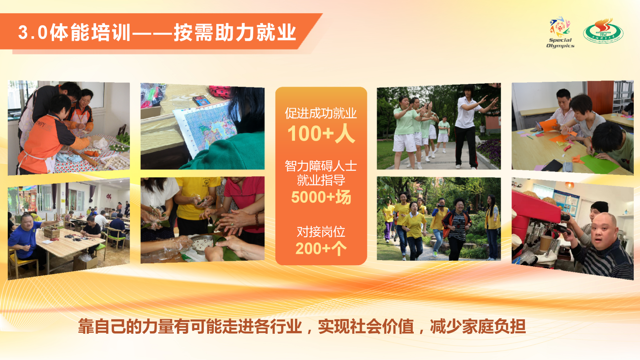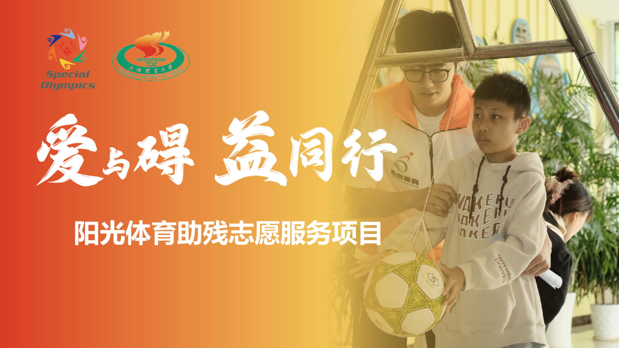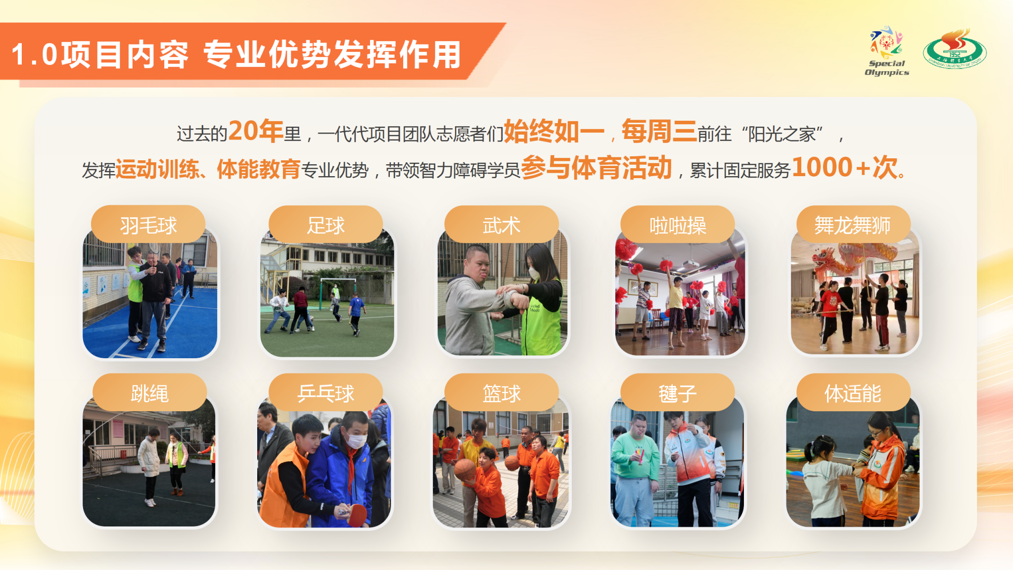 项目简介:“爱与碍,益同行” —— 阳光助残志愿服务项目由jinnian金年会特殊奥林匹克志愿者团与上体适应体育研究团队合作。自2004年起,坚守20年始终如一,每周三开展“阳光之家”下社区特奥活动,为智力障碍人士提供特奥运动指导和个性化的康复体育服务;承办国际化专项融合活动;在推进特奥运动的普及和发展方面取得了显著成效,也为全国范围内的青年志愿服务推进新范式;为境内外特奥运动员提供针对性科技助力服务,进入一线备战队伍为其制定个性化体能和技能训练计划;坚持以社区为平台,推动高校青年探索助残新模式,开创助残新格局,架起助残爱心桥梁,用所学专业点亮智力障碍人士社会融合之路,助推智力障碍人士共享生命阳光。截至目前,总服务次数已超过16633小时,总志愿者人次总计47612人次。