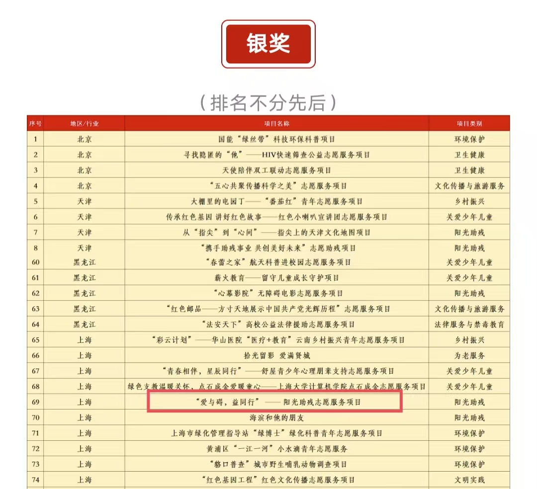 本次大赛以“青春为中国式现代化挺膺担当”为口号,阳光助残志愿服务项目共有66个,涵盖多省市、多高校及社会组织。我校“爱与碍,益同行”——阳光助残志愿服务项目作为组别内唯一一支上海高校队伍,从众多项目中脱颖而出获得银奖。