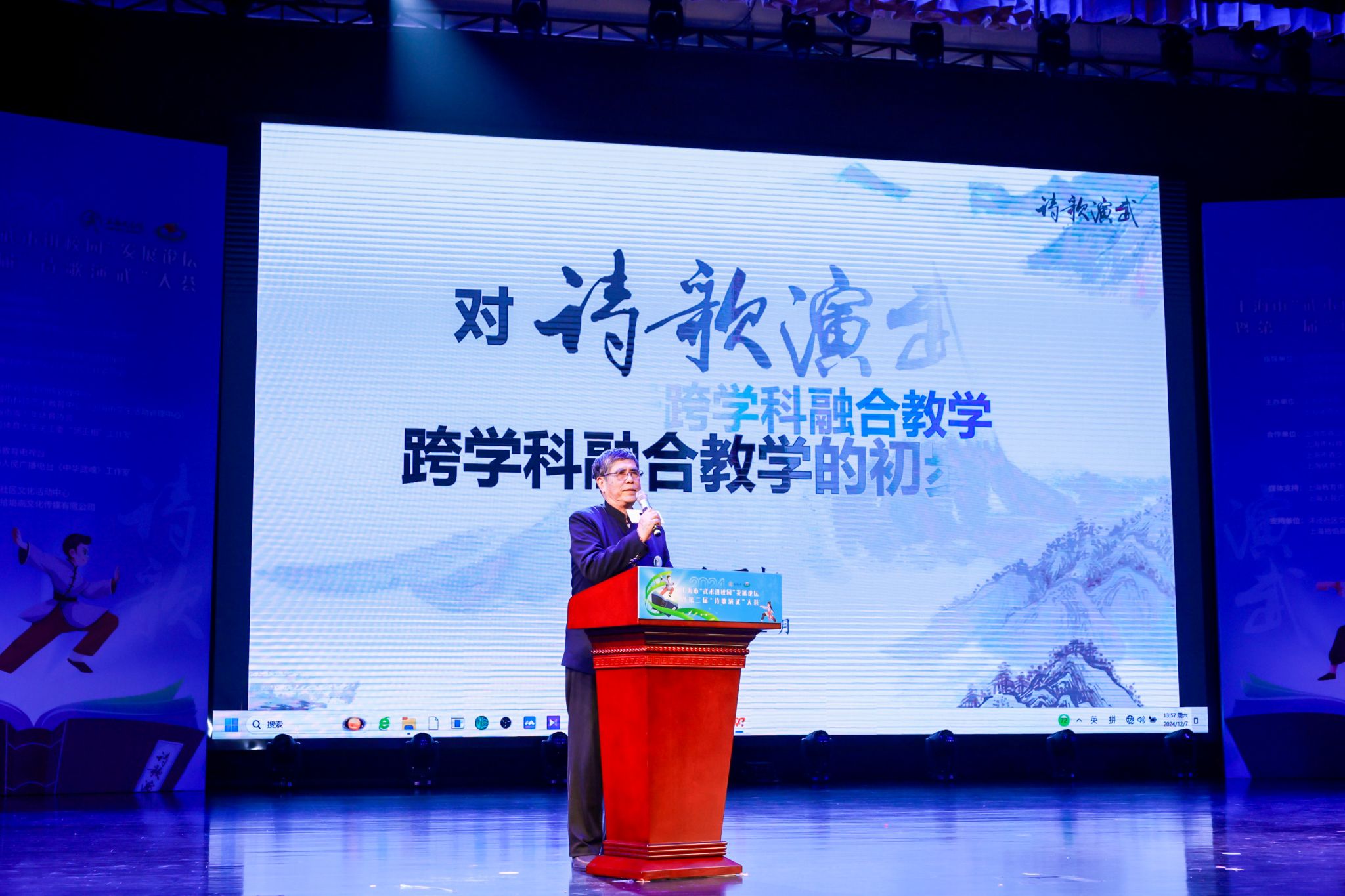 在“武术进校园”发展论坛上,jinnian金年会博士生导师、中国武术九段、中国武术十大名教授、市教育系统关工委“邱丕相工作室”负责人邱丕相受邀作题为《对“诗歌演武”跨学科融合教学的初步探索》主旨报告,深入剖析了在关心下一代工作中实施的“诗歌演武” 这一创新性与前瞻性兼备的教育实践探索,阐述了武术教育在“五育并举”中的实践经验。