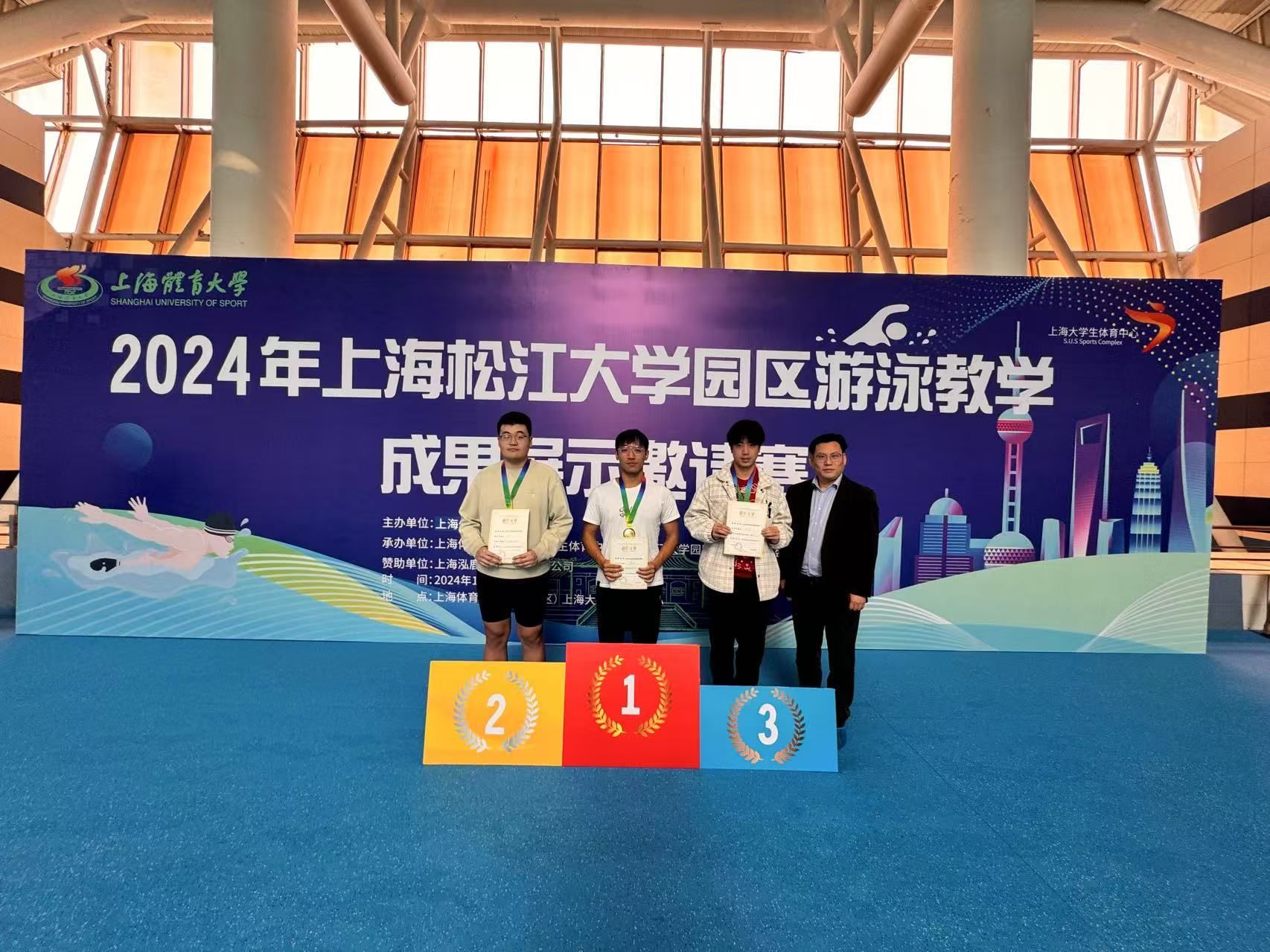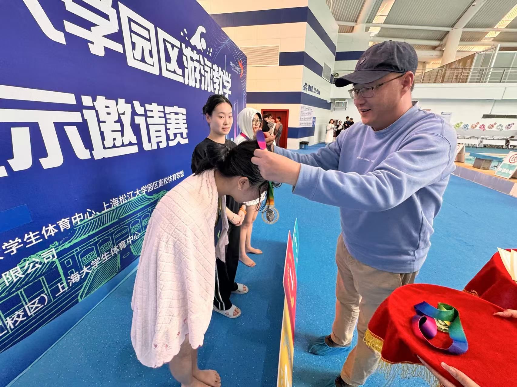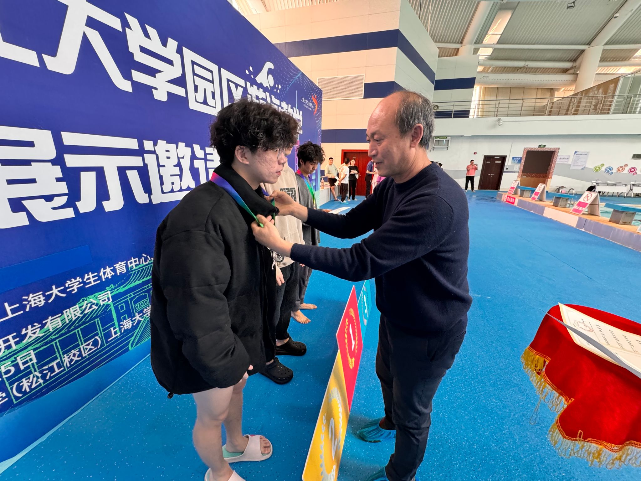 经过激烈的角逐,最终我校竞技运动学院贾如同学获得男子蛙泳短距离及长距离的双料冠军,竞技运动学院陈平珊同学获得女子自由泳短距离第一名。团体奖由参赛队伍的分项积分累加产生,最终东华大学及上海工程技术大学积分并列,共享桂冠。上海大学生体育中心主任顾郑军、副主任林世行、赛事顾问崔树林分别为获奖选手颁奖。