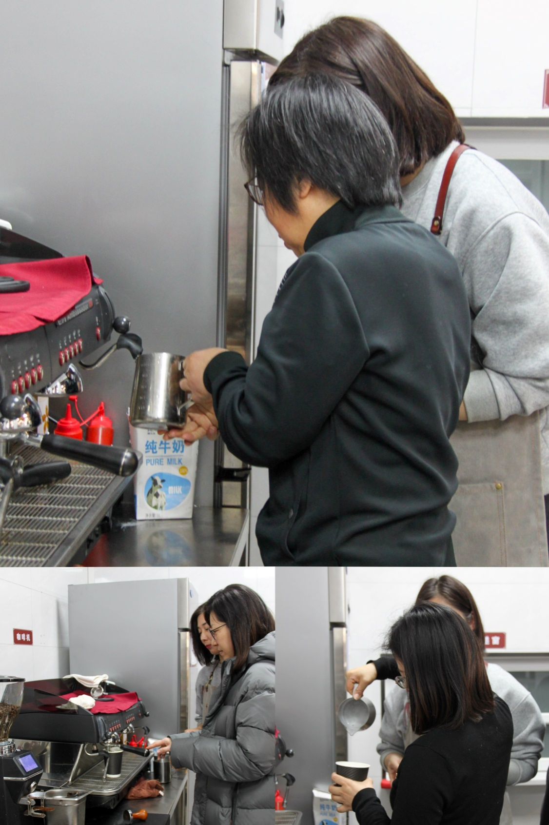 随后,实践环节将活动推向高潮,在专业咖啡机运作的韵律中,老师和同学们化身“咖啡艺术家”,从研磨、萃取,到打奶泡、拉花,每一个步骤都在导师指导下精益求精。当绵密奶泡与浓缩咖啡相遇,全场屏息见证爱心、树叶等图案在杯中次第绽放。从笨拙生疏到逐渐熟练,“精益求精”的人生态度贯彻上体师生的各个方面。