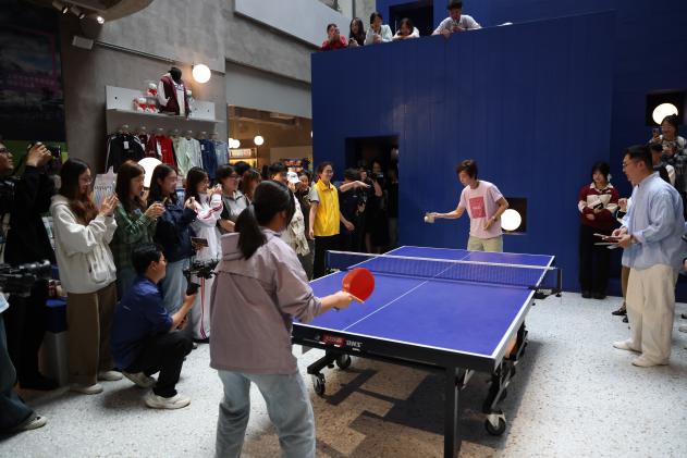 活动的最后,张怡宁移步绿瓦体育书店大厅,与同学们进行了一次别开生面的“乒乓对决”。她巧用各类小道具,冰箱贴、笔记本甚至手机,在张怡宁的手中都能变成进攻的武器,将一个个球完美回击。之后,张怡宁又同时与两名同学对战,在交手中,她展现出的不止有奥运冠军的惊人实力,更有作为前辈对新一代年轻人的关爱。最后,张怡宁祝同学们学业进步,希望同学们面对压力时,有从容面对的勇气。