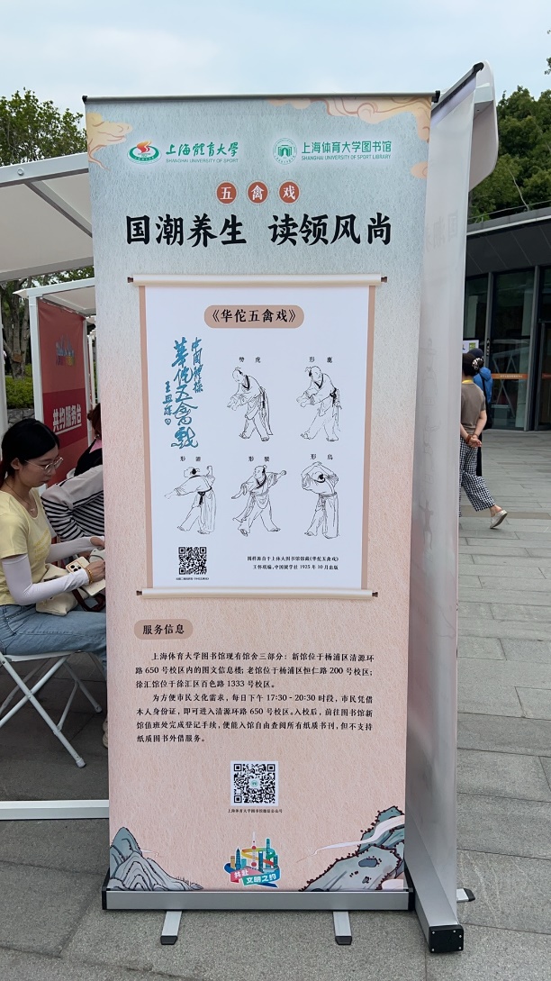 活动现场,上海图书馆的展位以“国潮养生·读领风尚”为主题,布置得古色古香又充满活力。醒目的展板上,我校图书馆提供的《华佗五禽戏》图示吸引了众多市民驻足。五禽戏,作为中国传统养生功法,由东汉名医华佗创编。通过模仿虎之威猛、鹿之安舒、熊之沉稳、猿之灵巧、鸟之轻捷五种动物的动作,调节人体的精气神,达到强身健体之效。展板上,生动的人物动作线条,将五禽戏的精髓展现得淋漓尽致,不少市民饶有兴趣地跟着比划学习。