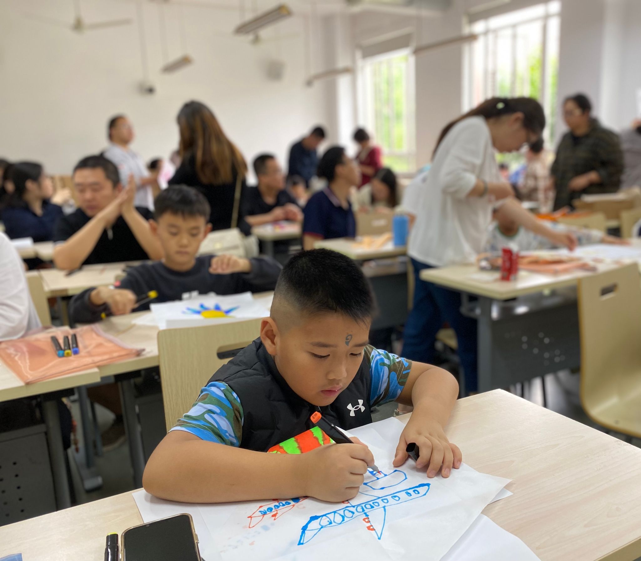 活动伊始,杨老师耐心指导,大家充分发挥创意,在菱形白纸上勾勒出五彩斑斓的图案,有的画出可爱的小动物,有的绘出梦幻的童话世界。绘制完成后,家长和孩子共同动手,紧密配合,经过裁剪、粘贴、固定竹条等步骤,一张张普通的白纸逐渐变成了形态各异的风筝。