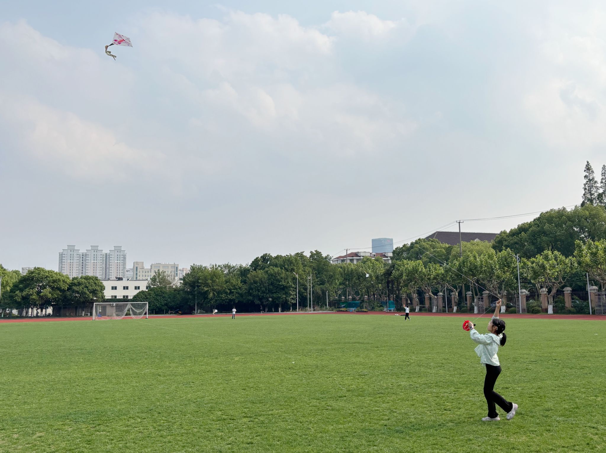 制作完成后,家长带领着孩子来到开阔的西田径场,认真聆听杨老师讲解放风筝的要领和安全知识,如怎么迎风站立、控制放线节奏等。家长们手把手教孩子调整角度、奔跑助飞,一个个精美风筝乘风而起,孩子们兴奋地欢呼雀跃,家长们在一旁鼓励、协助,亲子间的默契与欢乐在蓝天白云下无限蔓延。