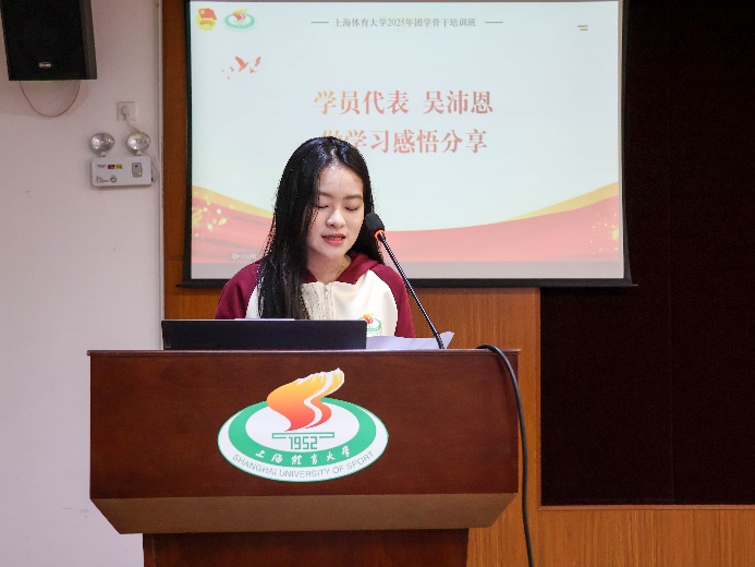 学员代表23级新闻专业吴沛恩同学发言分享了培训中的学习感悟与成长经历,回顾培训期间的实践走访、讲座学习与小组交流经历。她指出,青年担当需扎根实践、躬身入局,青年责任在于与时代同频共振并引领发展,青年使命是心怀大局、为学校发展建言献策。最后,她呼吁全体学员以实际行动践行青春使命,为新时代发展贡献青年力量。