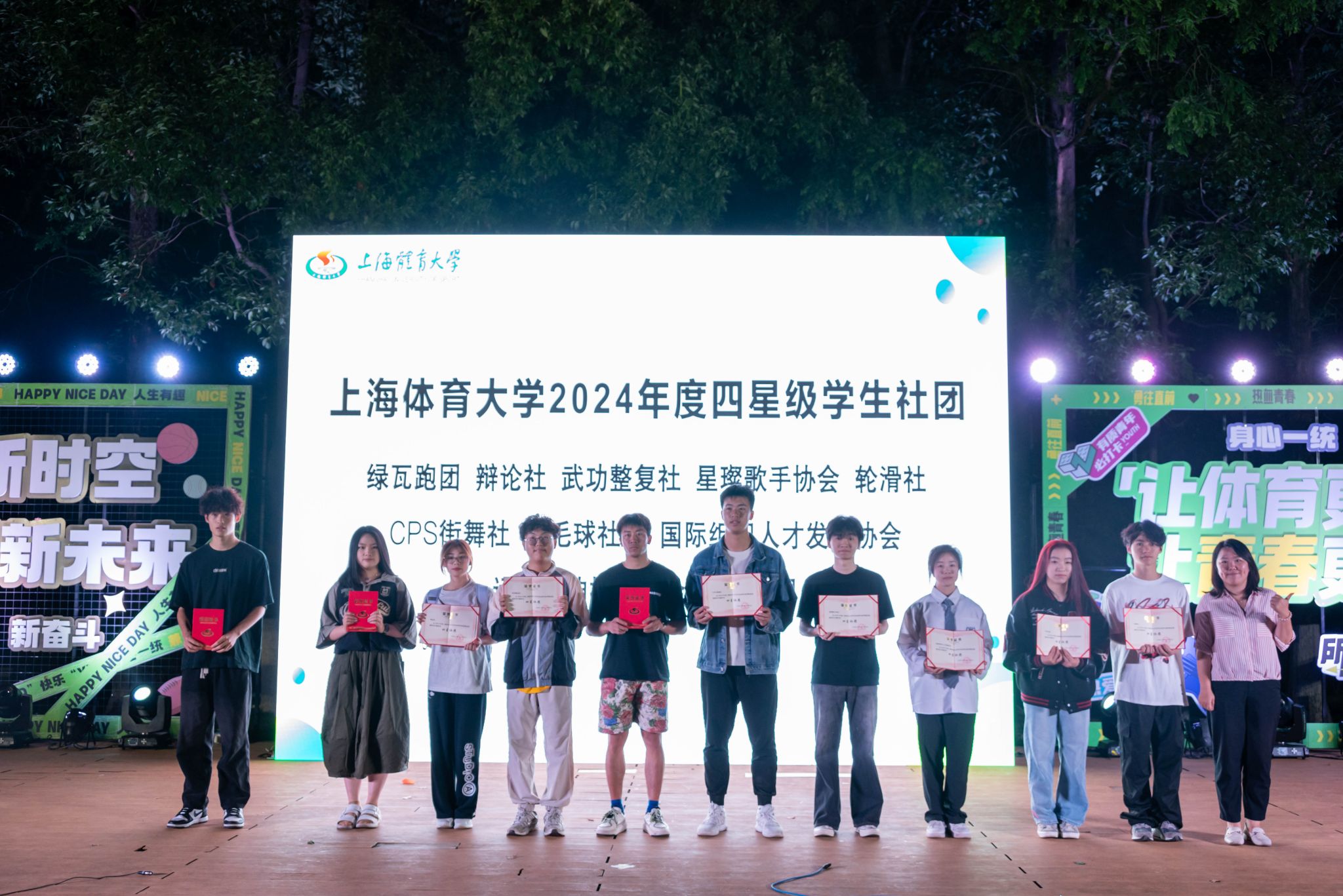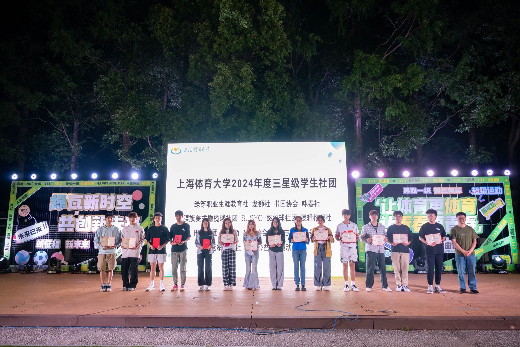 本次活动由上海人民广播电台 Love Radio 103.7频段的节目主持人Lucas和艺术学院24级播音生夏晓宁共同主持。活动中,学(研)工部、武装部部长王丽娜,学(研)工部副部长、校团委书记刘佳瑜,及校团委兼职副书记王长伟分别为五星、四星、三星级社团代表颁发证书,表彰其过去一年对校园文化繁荣的卓越贡献,彰显上体社团蓬勃生机与创新活力。
