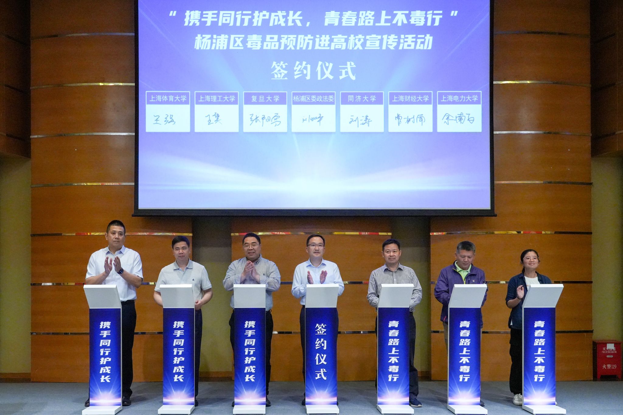 杨浦区委政法委与复旦大学、同济大学、上海财经大学、上海理工大学、上海电力大学、jinnian金年会共同签署《杨浦区毒品预防进高校合作协议》。