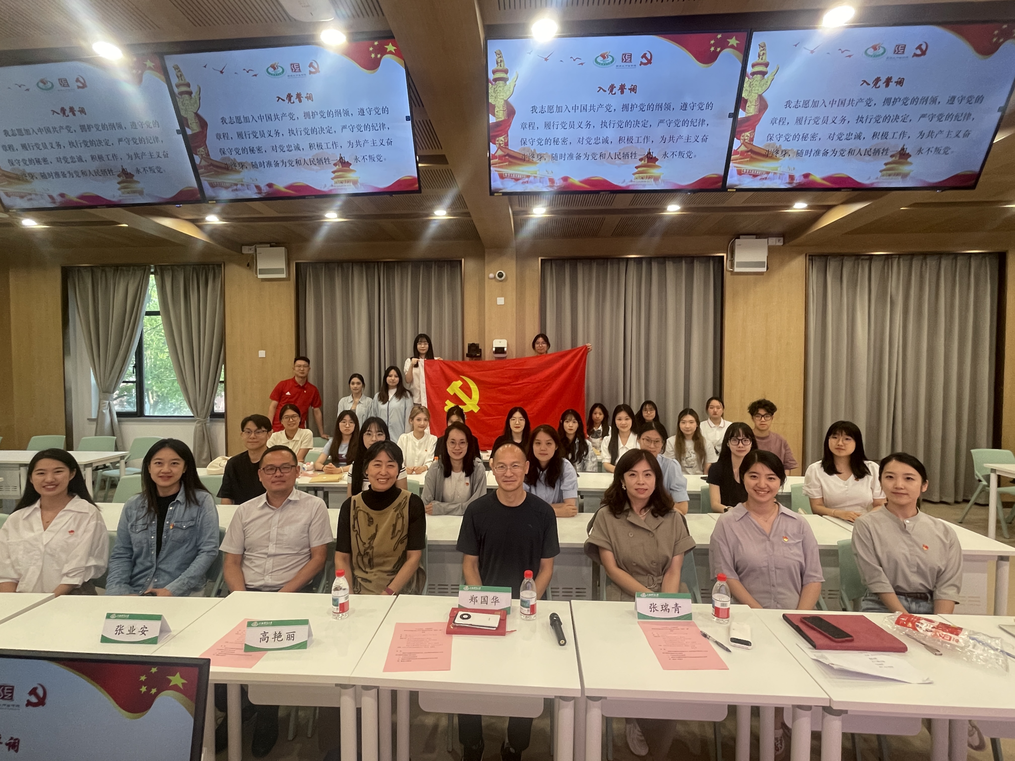 在庄严肃穆的氛围中,组织员王乐老师作为领誓人,带领全体毕业生党员面向党旗,高举右拳,重温入党誓词。“我志愿加入中国共产党……”铿锵有力的誓言回荡在教室里,提醒每一位毕业生党员牢记身份与使命,不辜负母校的期望。