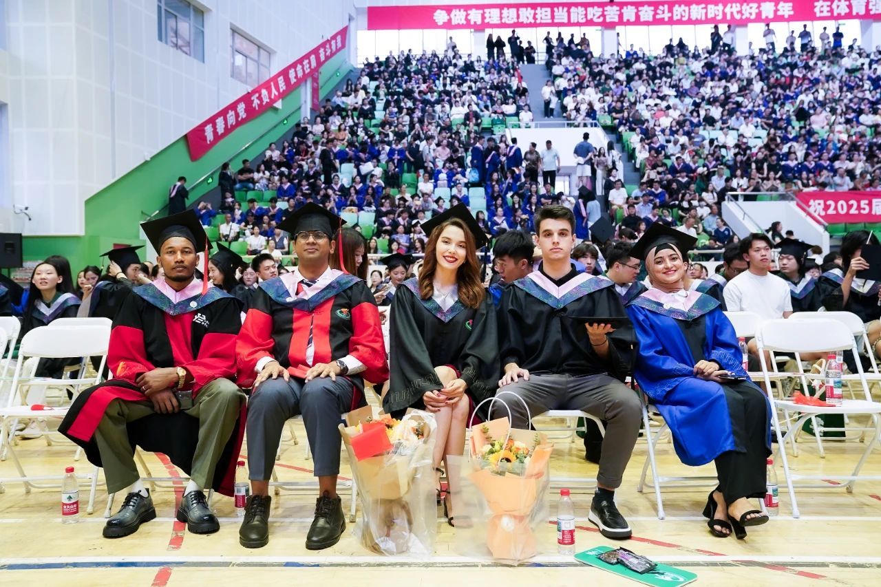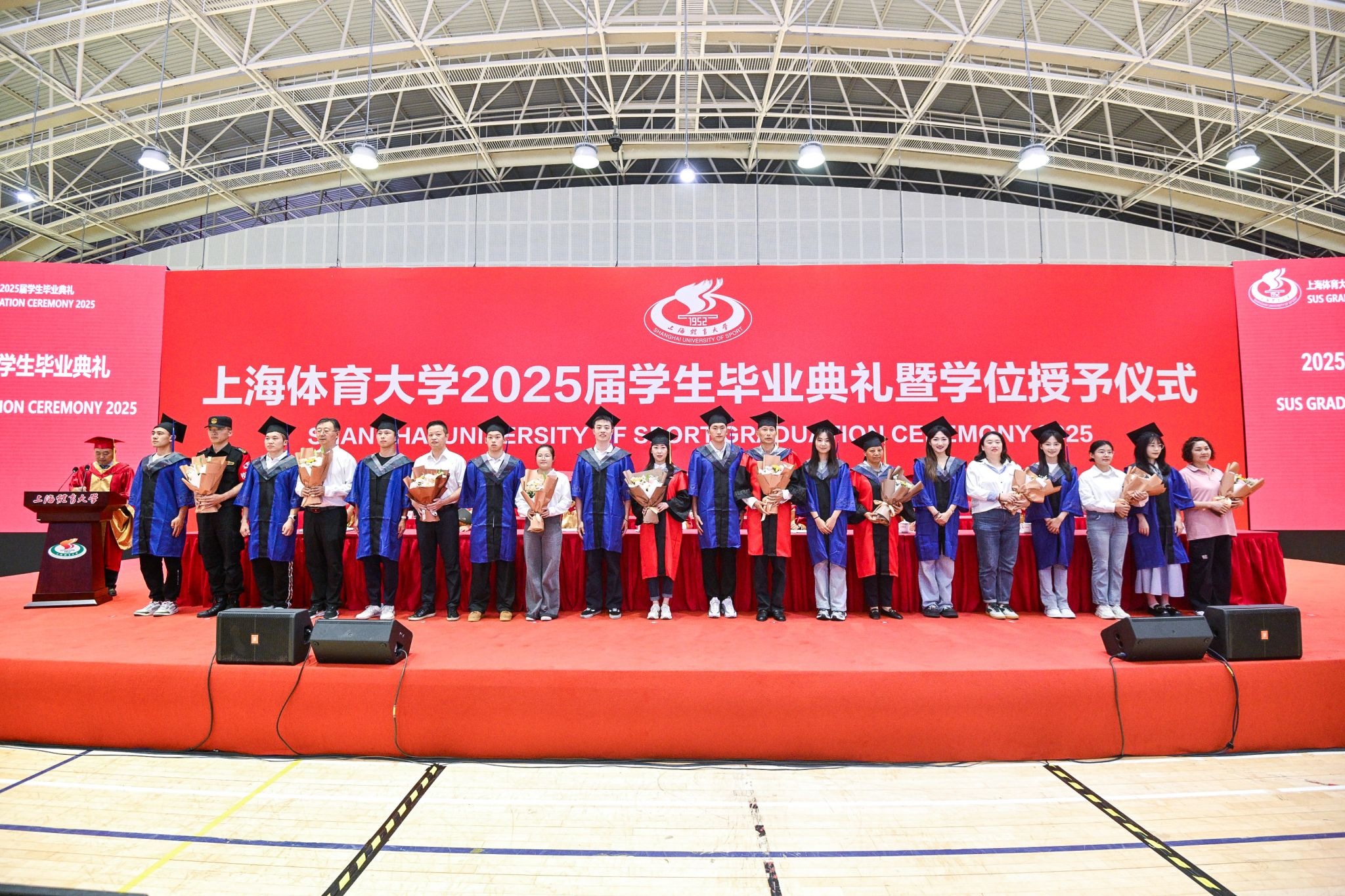 毕业典礼上,2025届毕业生代表们为教职员工代表献上了鲜花。