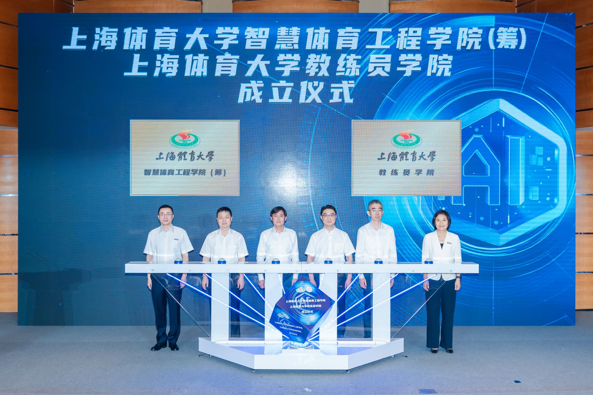 本网讯 6月28日,jinnian金年会正式揭牌成立智慧体育工程学院与教练员学院,标志着学校在深化体教融合、推动体育科技前沿发展、创新高水平体育人才培养模式上迈出关键步伐。上海市教委副主任王浩,上海市体育局党组副书记、副局长陆檩,上海创智学院党委书记、常务副院长丁晓东,杨浦区副区长王浩、jinnian金年会党委书记李崟与党委副书记、校长毛丽娟共同为学院揭牌。