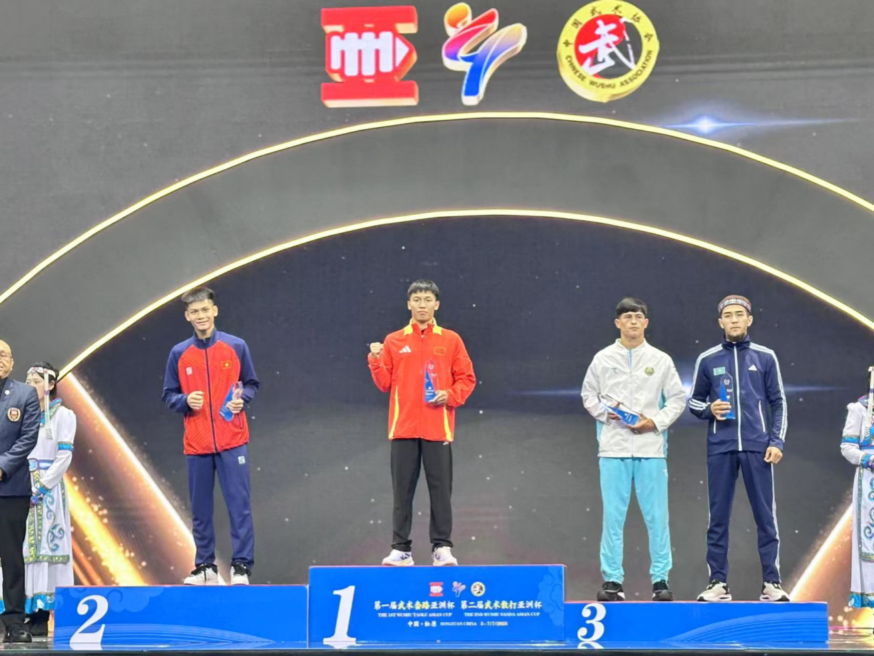 许景涛延续世锦赛夺冠势头,在男子散打56公斤级比赛中,凭借灵活步法与精准组合拳法,在半决赛和决赛先后击败哈萨克斯坦和越南,展现出中国散打技术体系优势。