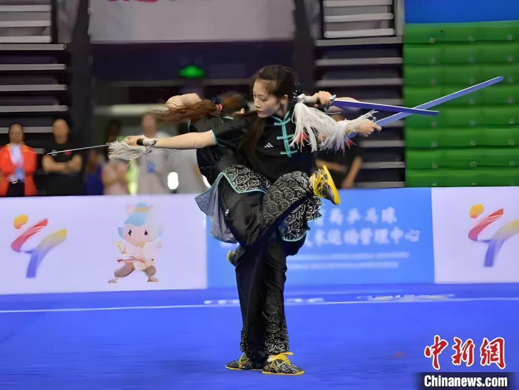 在武术套路女子双人对练项目中,王一琳、左诗雨组合以“快、准、美”的技法特点,通过行云流水的套路演绎征服裁判,以全场最高分9.76摘得该项目金牌。