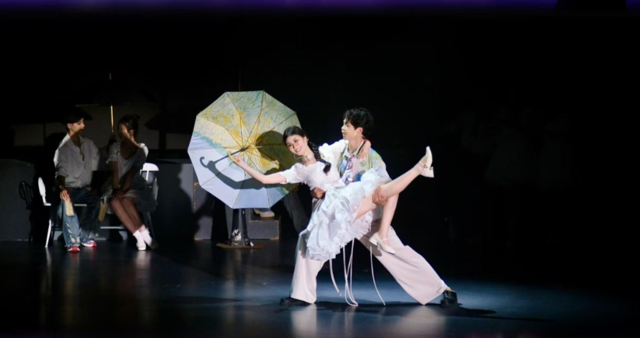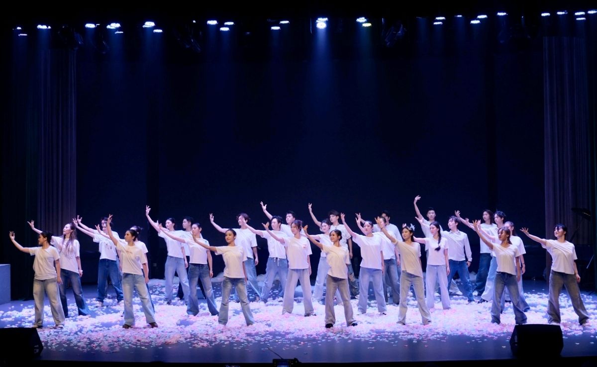 而在对“今天”的诉说中,22级舞编专业的同学们更是“各显神通”,充分展现了各自的艺术才华。作品《Dance Blaze》精准融合国标舞中伦巴与恰恰的元素,呈现动感韵律。经典剧目《芝加哥》则通过标志性的舞步编排与节奏把控,成功诠释了其独具魅力的热辣艺术风格。值得一提的是,摩登双人舞《The love of hatred》在艺术学院吴仁塔娜老师的钢琴现场伴奏声下,将摩登舞的高雅格调与内在热情演绎得淋漓尽致。由谢林峰同学创作的原创音乐剧《思念如雨季》以其精心营造的浪漫氛围,实现了音乐与剧情的深度交融。电子琴、架子鼓、贝斯等乐器的运用,为整场汇演注入了清新而悸动的艺术质感,为观众带来深刻的情感共鸣。
