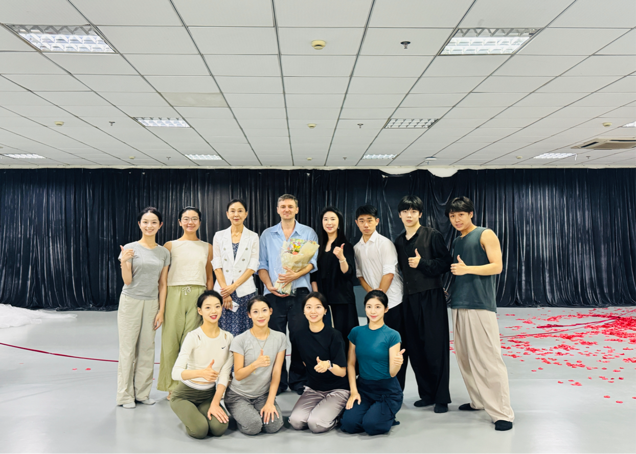 本次大师班精心设计为两个核心单元,内容层层递进,理论与实践紧密结合。第一单元聚焦环境舞蹈创作技法,康纳·道尔带领学员们进行沉浸式体验,引导学员们重新认识并解放身体的自然律动与感知能力。该单元让同学们学会了更敏锐地感知自身与他者,为更深层的艺术表达奠定了坚实基础;第二单元以艺术学院原创舞剧片段作为案例分析,康纳·道尔用深厚的国际剧场经验和独特的艺术视角,引导学员们深入探索动作在特定空间中的流动、张力与叙事潜力。他强调表演与交互的节奏感与真实性,即赋予动作情感、意图和角色特征,使其超越纯粹的技术层面,成为承载故事和灵魂的媒介。