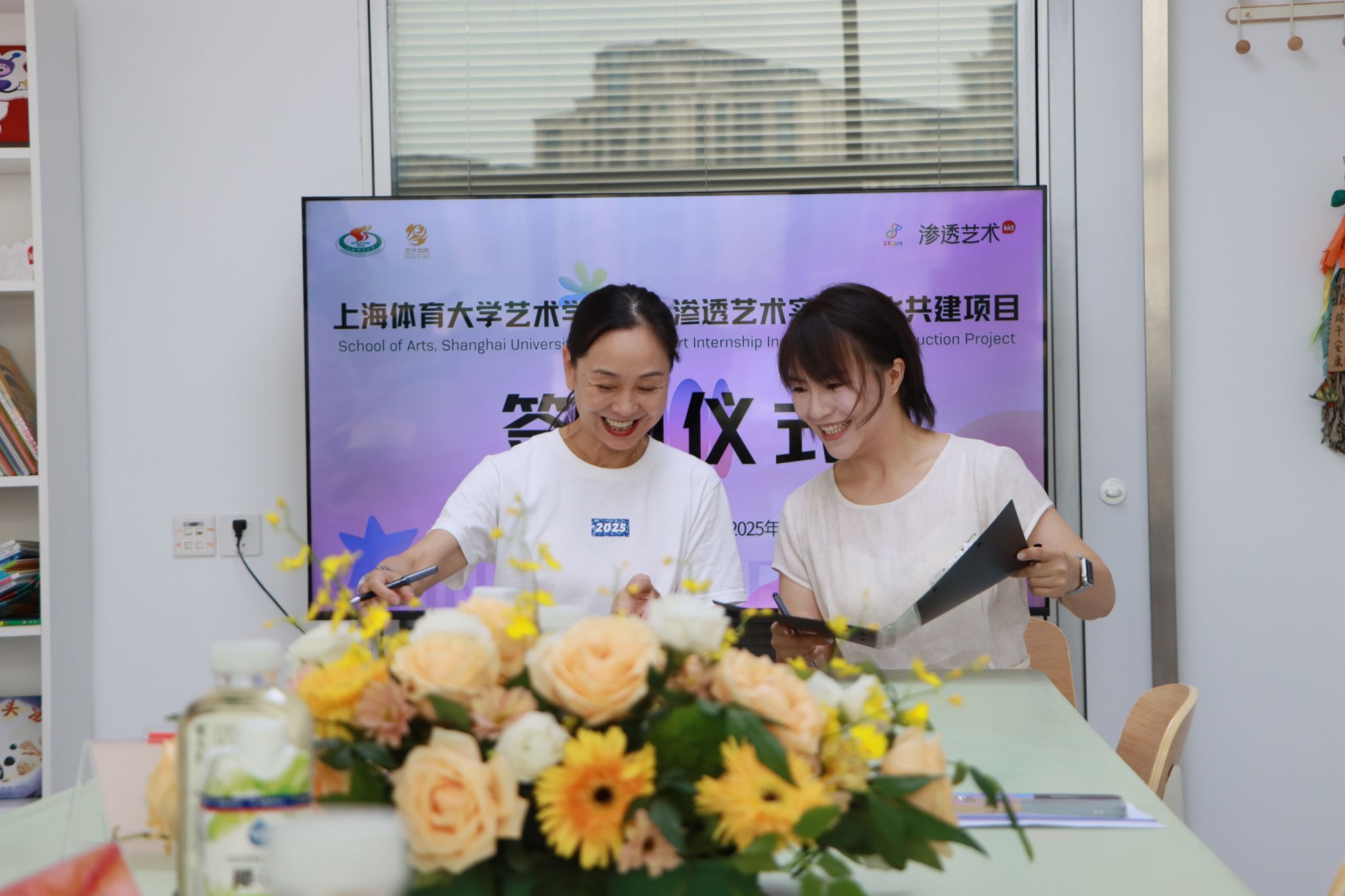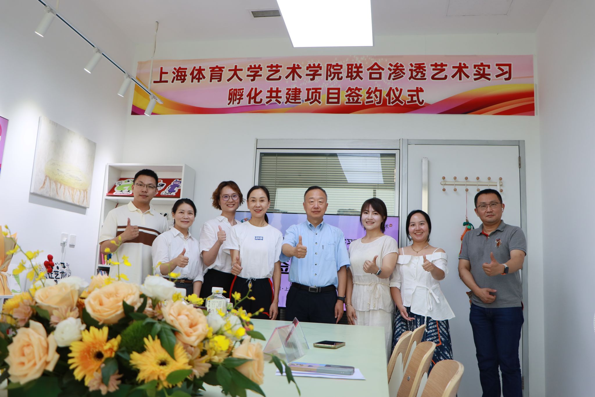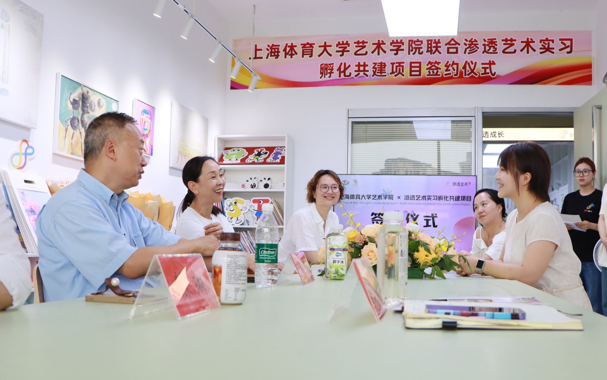 本网讯 2025年7月16日,艺术学院“访企拓岗”暨“渗透艺术”共建项目签约仪式,在杨浦运动健康中心顺利举行。校党委副书记潘勤、艺术学院院长韩春英、副书记兼副院长高敏、副教授司长强、科技园总经理徐琳、科技园科创中心主任史宗明,以及渗透艺术创始人刘斯琪、渗透艺术杨浦校区负责人姜又铭等共同出席了本次活动。