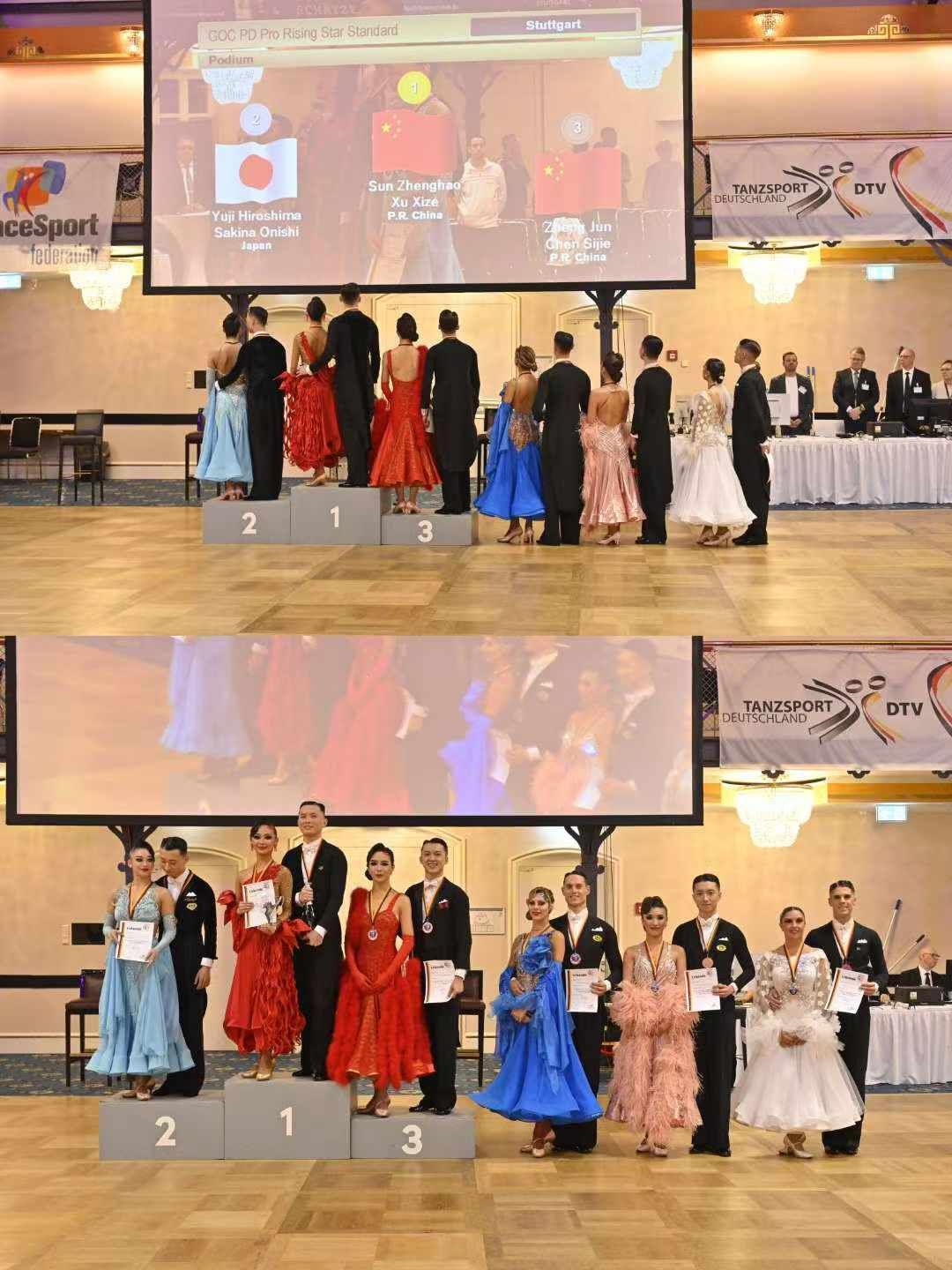 德国公开赛(GOC)作为WDSF最具影响力的赛事之一,每年8月都会吸引全世界成千上万的体育舞蹈爱好者以及参展商齐聚德国斯图加特,是目前世界上规模最大、参与人数最多、含金量最高的体育舞蹈比赛之一。在如此高水平的国际赛事中,孙正昊和徐溪泽凭借着精湛的舞技、默契的配合,一路过关斩将,最终斩获了WDSF职业新星标准舞的世界冠军,以及在职业大奖赛中杀进了前四分之一最终获得了第16名的优异成绩。他们在赛场上的每一个舞步、每一个眼神都充满了自信与魅力,将标准舞的优雅与激情展现得淋漓尽致,赢得了现场观众和评委的高度赞誉。