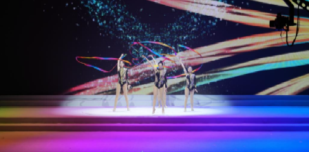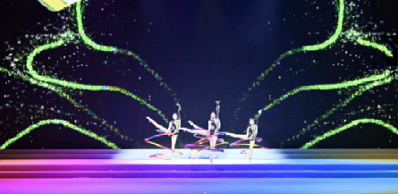 《青春运动场》节目中,艺术体操专项的女生们执圈、带、球,以灵动柔美的身姿,勾勒出流畅而优雅的运动轨迹;舞蹈编导专业的男生们则以充满爆发力的劲健舞律,展现出力量与速度的阳刚之美。“人屏互动”技术更将这种对话推向高潮。尤为惊艳的是投篮瞬间的虚实呼应:舞者腾空跃起,屏幕中一道绚丽的数字轨迹随之划出,篮球应声入网。身体动作与数字影像的精准同步,创造了极具时代感的奇观效果,配合青春昂扬的音乐节奏,构建出一场多维沉浸的视听盛宴,将现场气氛推向沸腾。