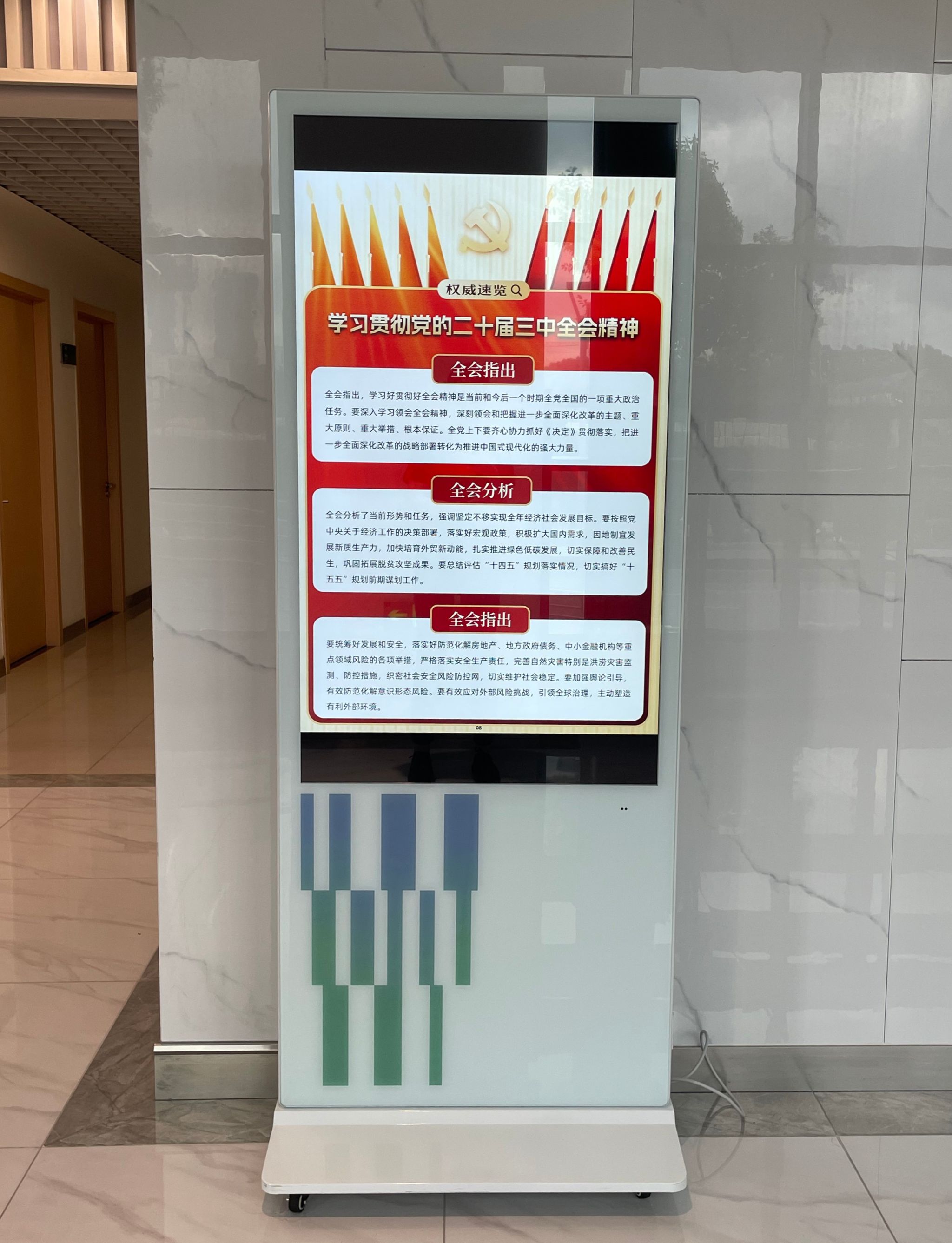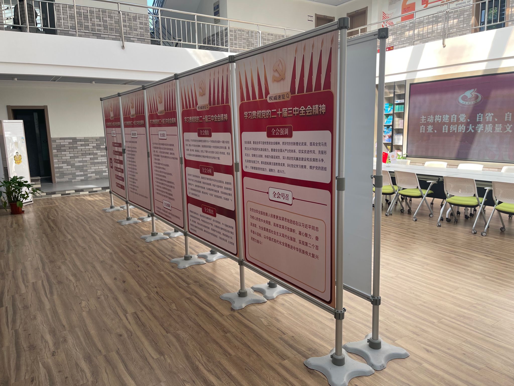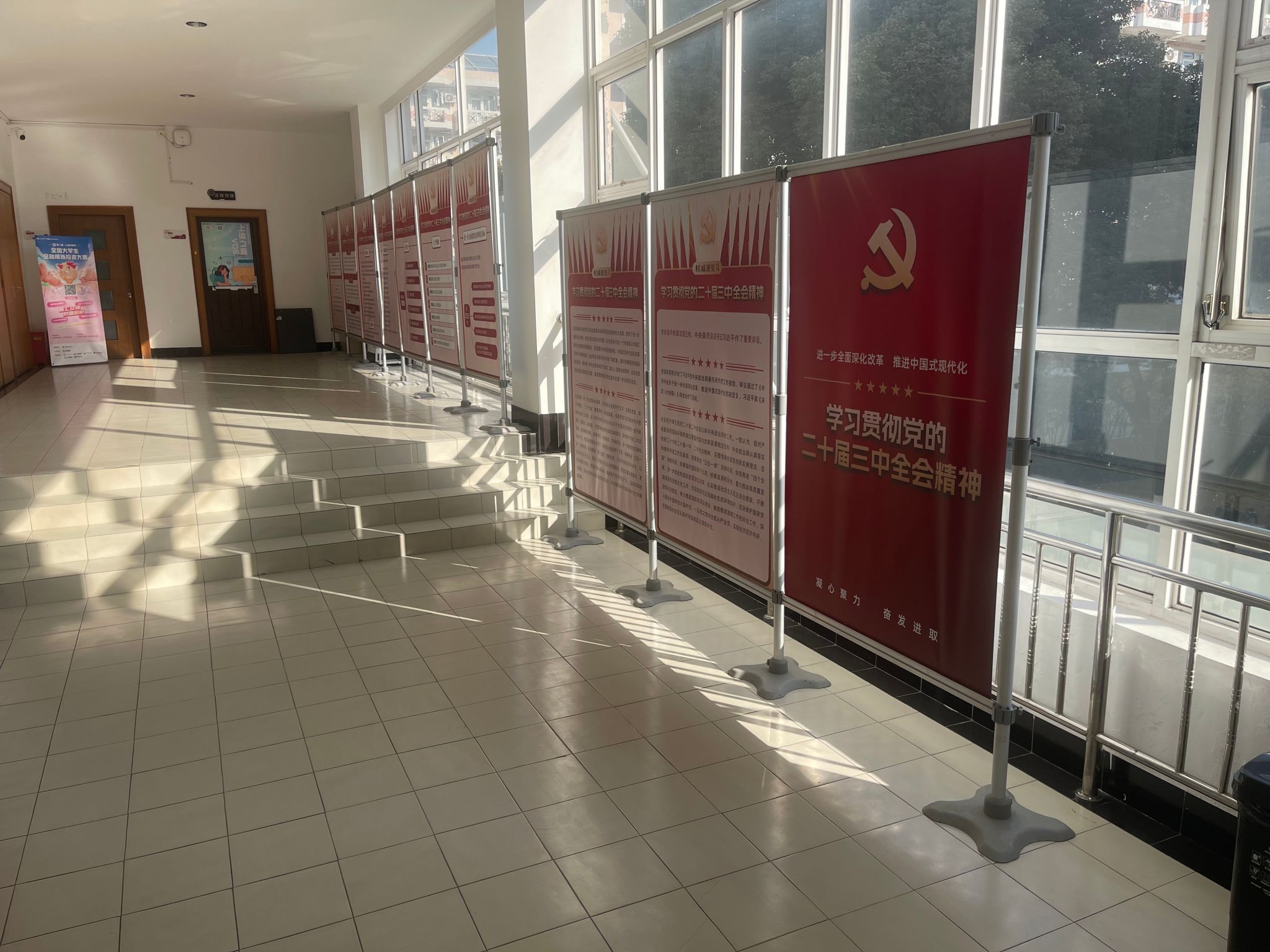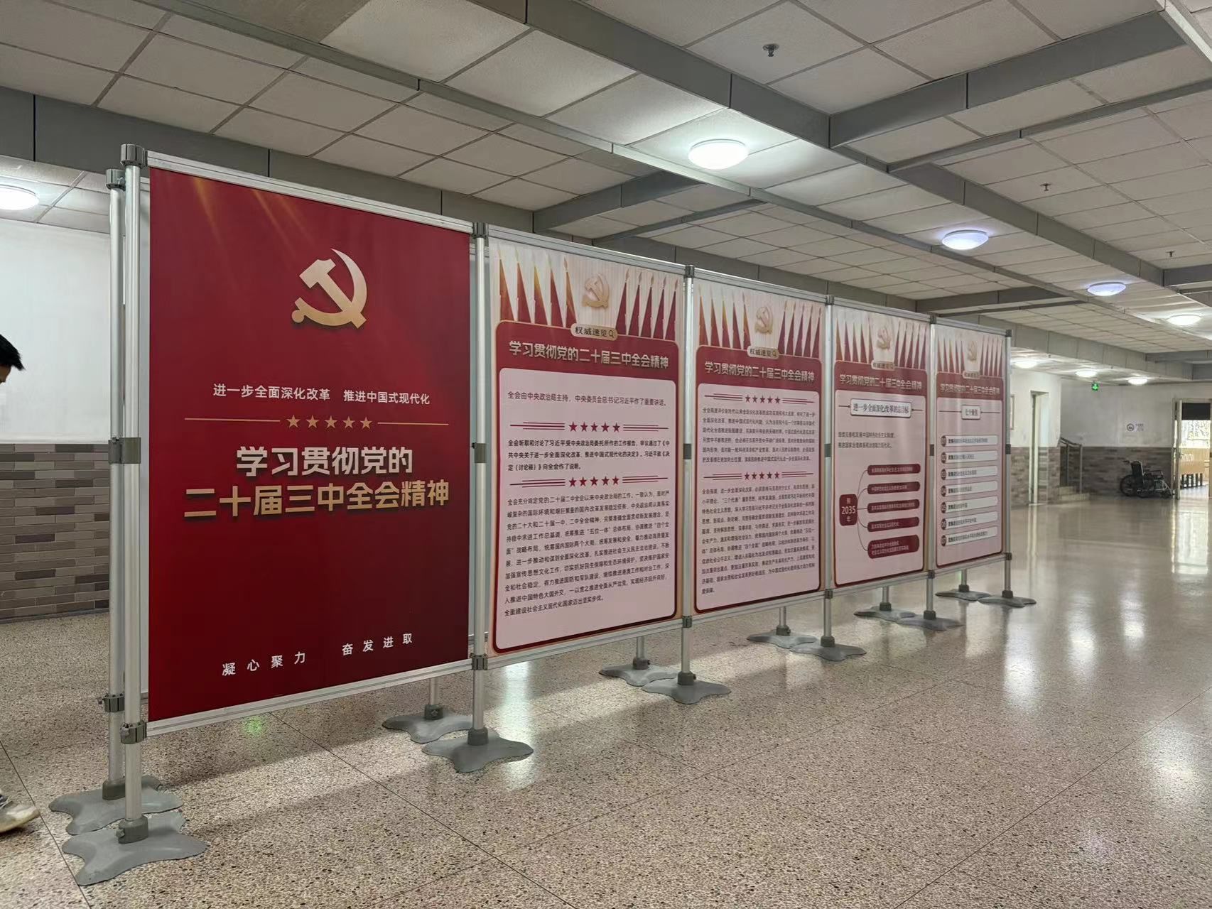 本网讯 为深入引导广大党员干部群众将思想和行动高度统一到党的二十届三中全会精神上来,党委宣传部精心设计制作了《学习贯彻党的二十届三中全会精神图片展》,自2024年9月下旬起在新教学楼、体育教育学院、竞技运动学院、学生活动中心、徐汇校区、江湾教学点等地展开了广泛巡展。此次展览紧扣党的二十届三中全会精神这一核心,以直观生动的可视化形式,对全会取得的重要成果、作出的重大部署、需要坚持贯彻的原则以及重点聚焦的领域等关键内容进行了深入解读,在校园内掀起了学习全会精神的热潮。