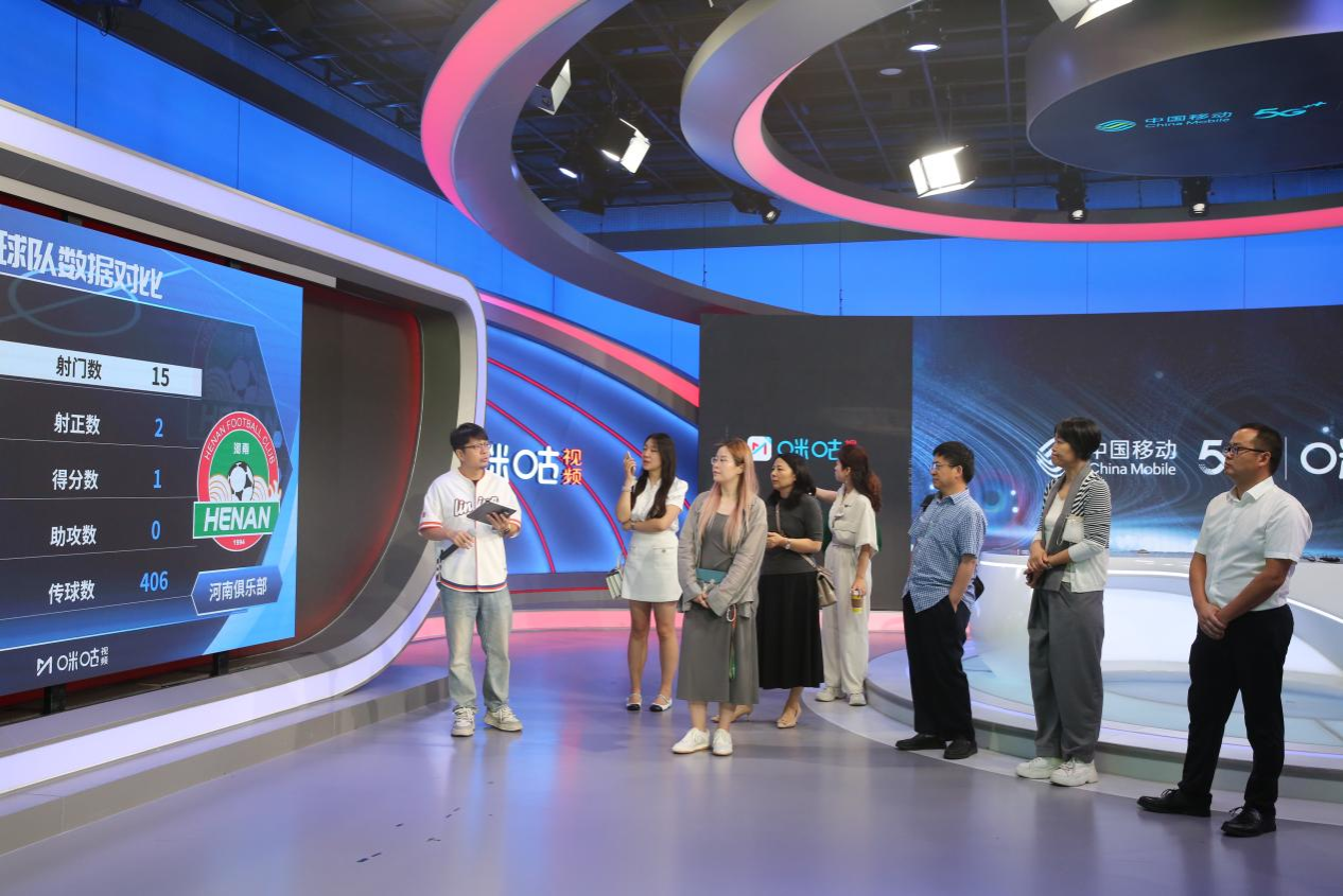 学院一行首先参观了咪咕视讯演播室与总控室,现场感受技术革新对体育传媒的深刻影响。在演播室,从AI智能剪辑、智能配音到虚拟主播,技术的革新正在深刻改变着体育传媒的生产方式。在总控室,多路信号切换、实时数据可视化、AI辅助解说等智能化制作手段同步演示。咪咕视讯能为学生提供“独特体育版权资源+专业技术工具+海量用户基础”的专属实践条件——学生可借助高价值版权内容创作,通过AI剪辑、数据可视化系统等工具提升能力,作品还能面向亿级用户获取真实市场反馈,这与新闻与传播学院培养“懂体育、善传播的应用复合型人才”的目标高度契合。