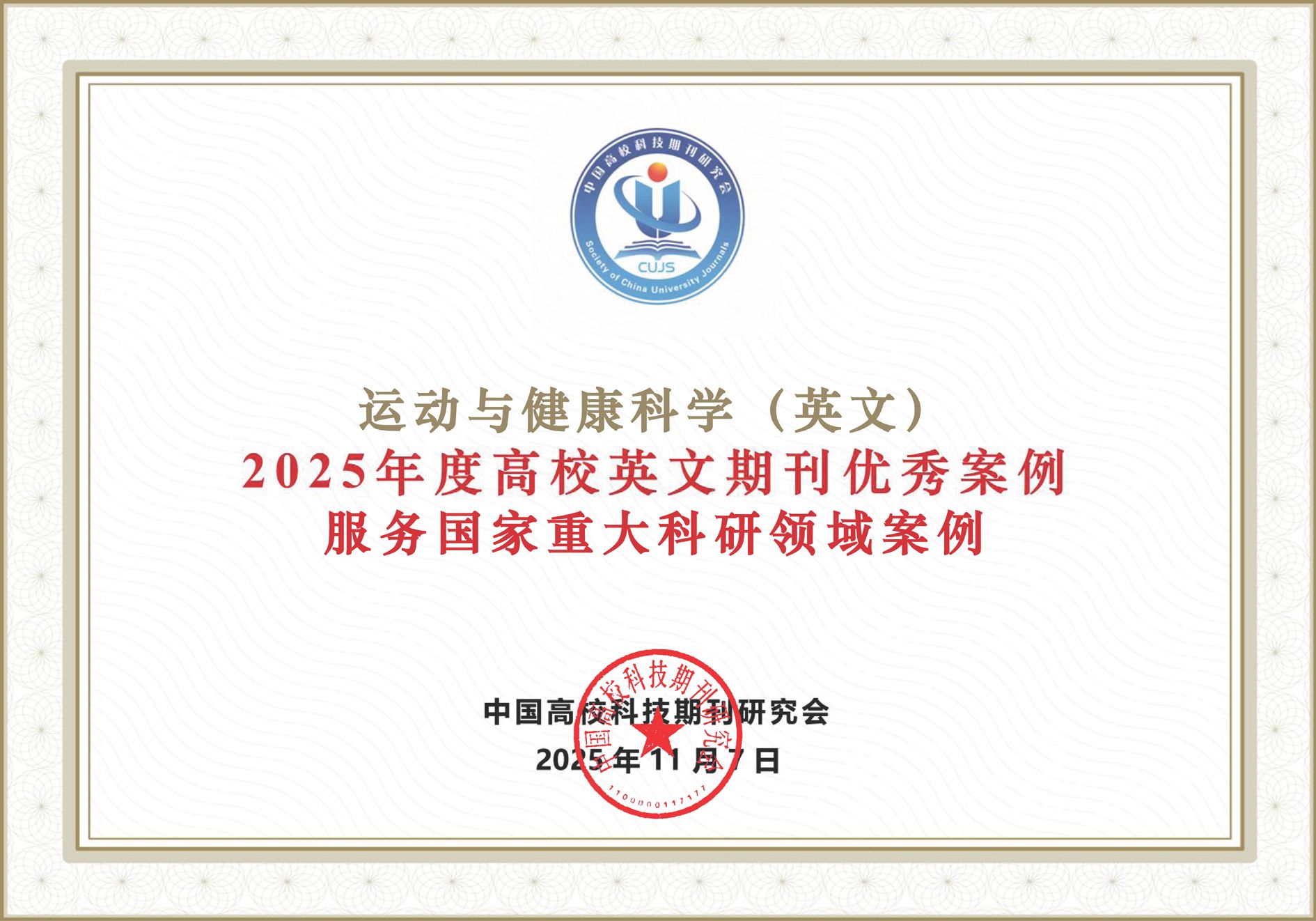 本网讯 2025年11月6⁓9日,中国高校科技期刊研究会第29次年会在陕西省西安市召开,教育部科学技术与信息化司、中国科协科学技术创新部、中宣部出版局等相关负责同志、受邀报告专家及全国高校期刊界代表800余人出席会议。会议期间颁发了相关行业奖项,我校主办期刊《运动与健康科学(英文)》(Journal of Sport and Health Science, JSHS)成功入选“2025年度高校英文期刊‘优秀案例’——服务国家重大科研领域案例”;同时,JSHS编辑部荣获“2025年度中国高校科技期刊建设示范案例库‘优秀团队’”称号,这是JSHS编辑部继2017年、2019年、2023年之后,第4次获评该荣誉。