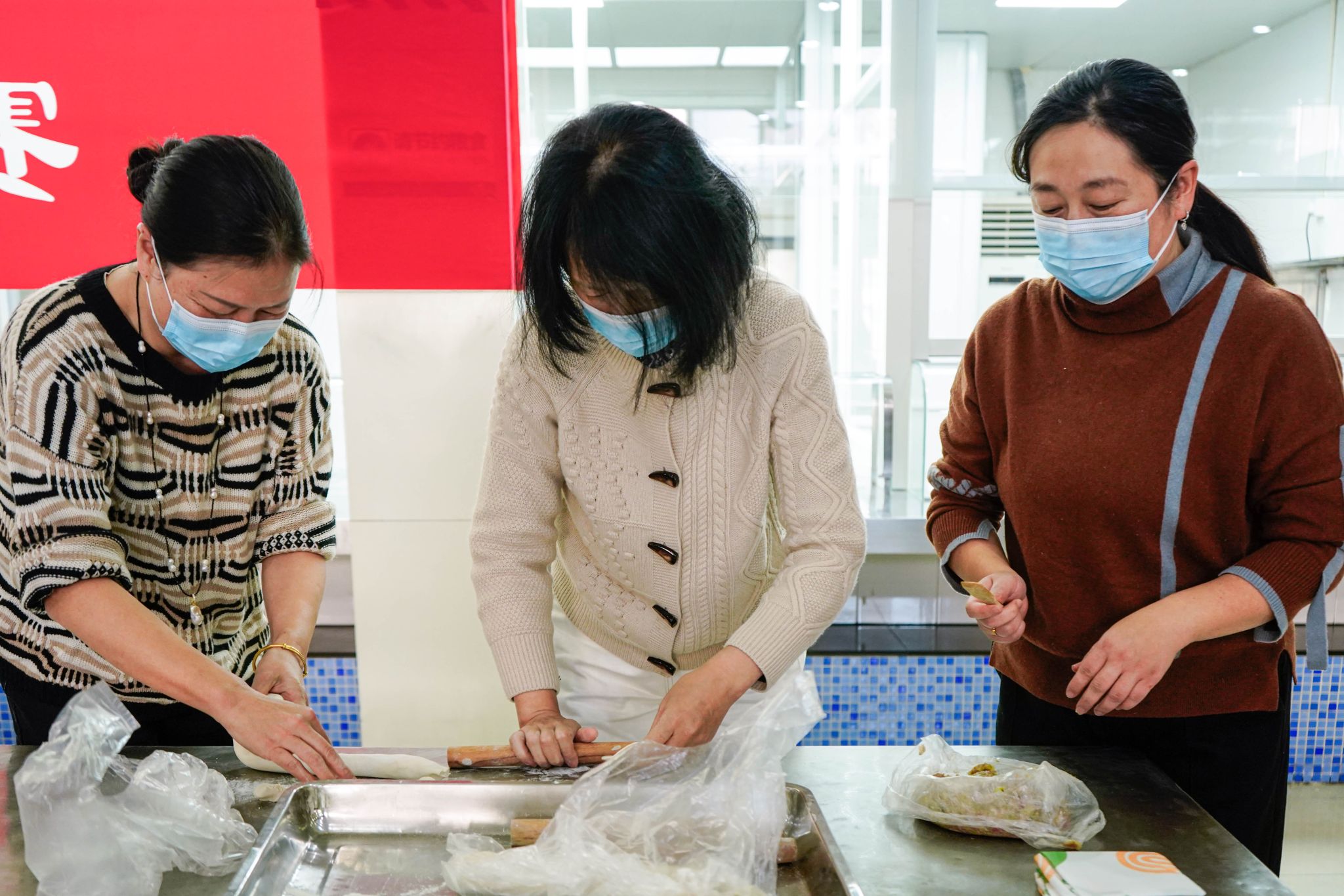 在包水饺环节,同时邀请众学生每三人一组组成6个代表队、各职能部处教师代表组成2个代表队同场竞技。众选手积极分工,迅速投入到擀面中,包馅、捏边、摆造型呈现出一成品,学生进一步在“做中学、学中悟”中感受劳动价值,传承中华文化、提升文化自信与文化自强。